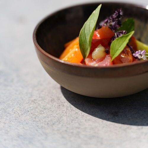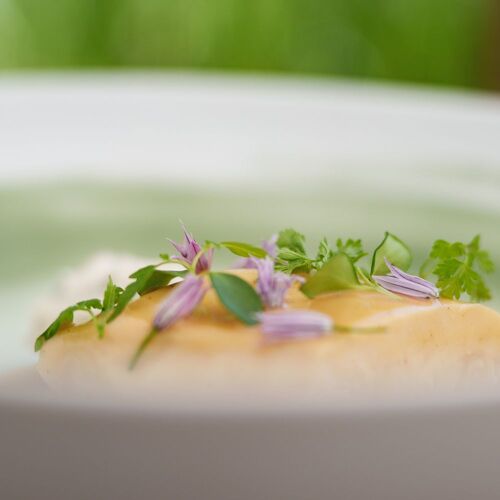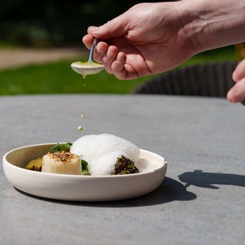 Élégance et luxe baignent les Jardins d’Anaïs, de la véranda avec vue sur le jardin jusqu’aux chambres, sans oublier le chariot à champagne. Cela n’empêche pas le chef de sortir de temps à autre des sentiers battus, en donnant libre cours à sa créativité. Un sorbet de gin et caviar accompagne ainsi un filet d’esturgeon fumé, ou encore ce subtil équilibre entre asperges, foie gras et pamplemousse. Il aime jouer avec les saveurs, avec une cuisine audacieuse.