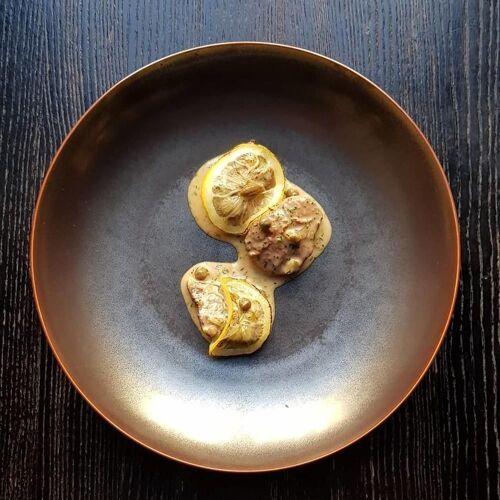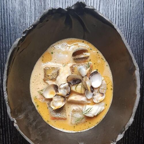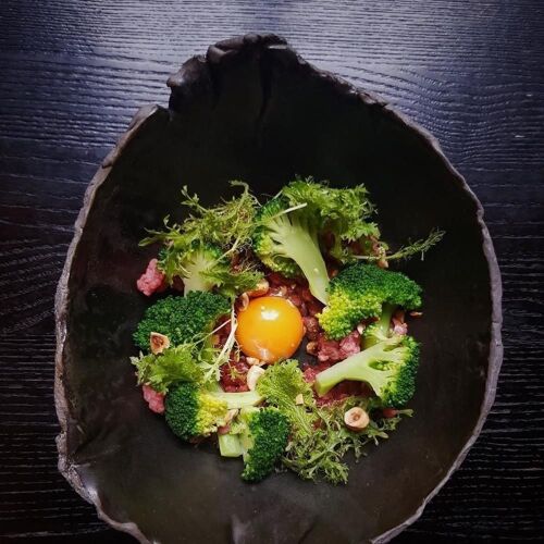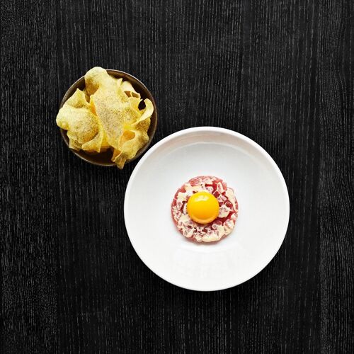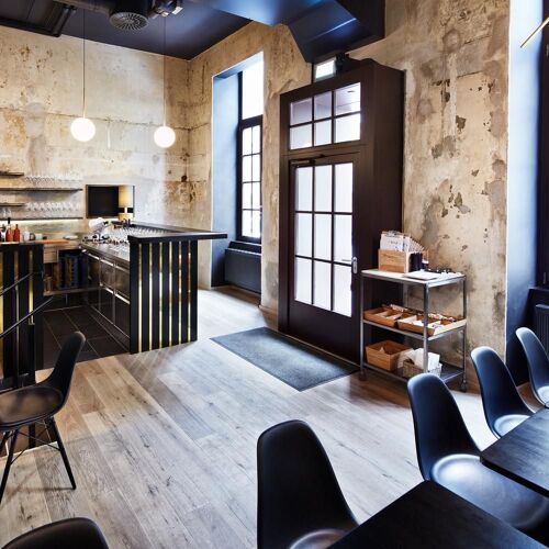 Industrial-chic design and soaring ceilings set the tone in this inviting modern bistro, complemented by a cosy bar area for pre-dinner drinks that adds to the laid-back, welcoming vibe. The kitchen serves Mediterranean-Greek inspired dishes, reflecting the cultural heritage of owner Konstantin Filippou, whose fine dining restaurant happens to be located right next door. The dishes are usually served as smaller portions, making them ideal for sharing. For the main course, you can choose between meat, fish and veggie options, which change periodically. There is also a pleasant outdoor dining area.