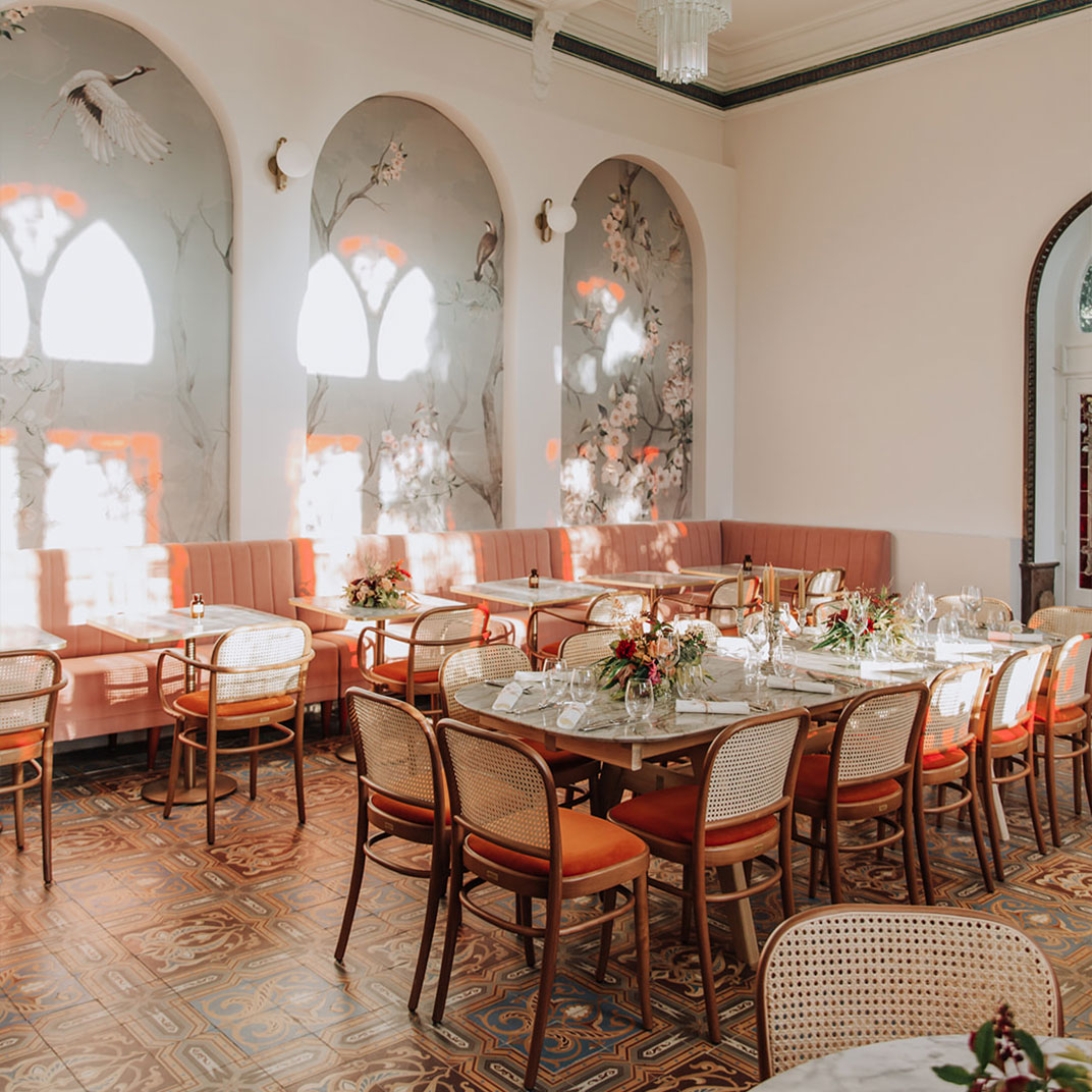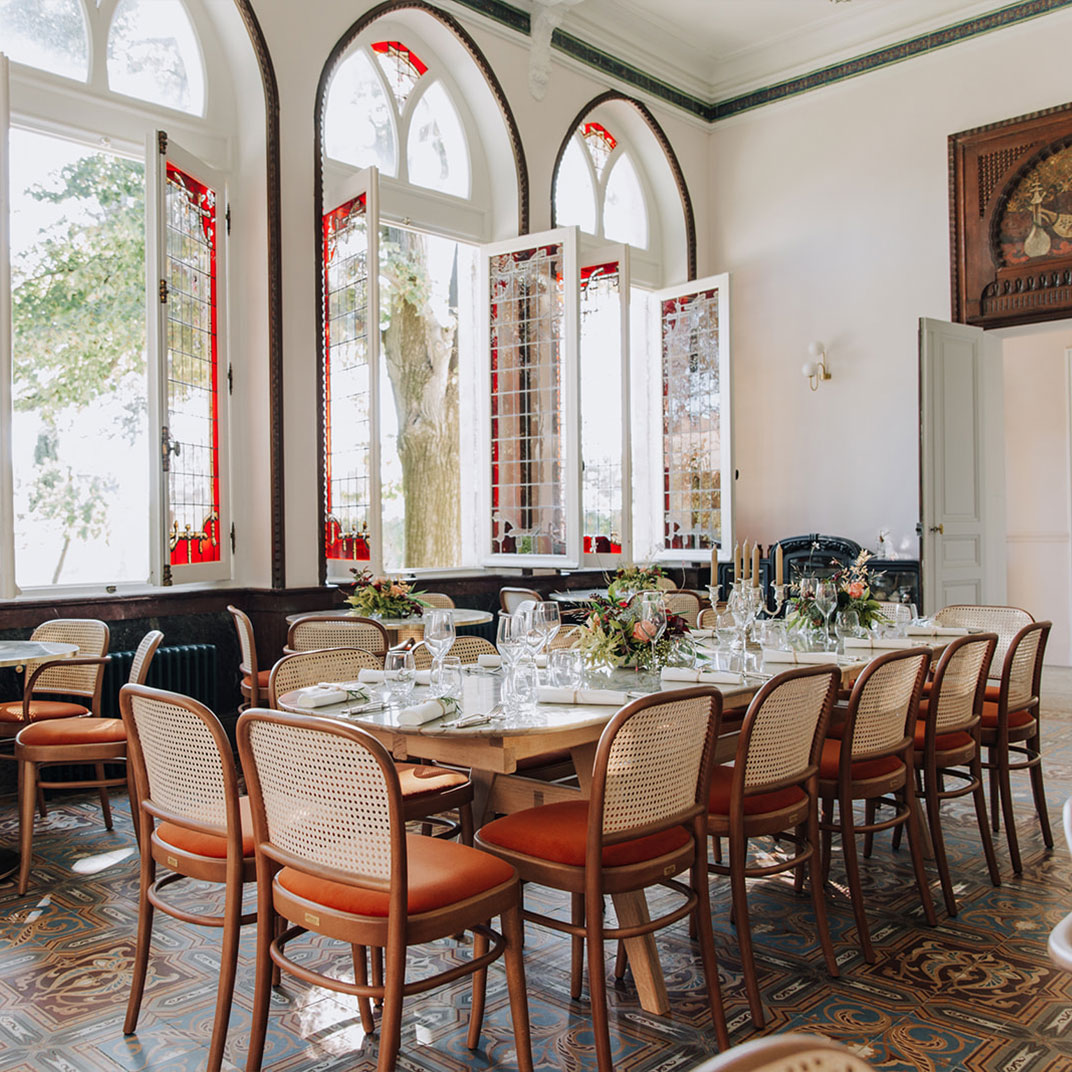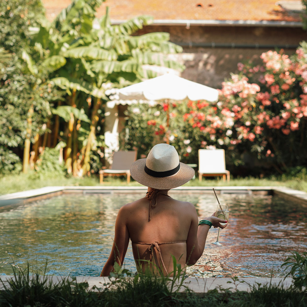 While there’s no doubt the upstairs suites are dreamy, equally intriguing are the owner’s original Moorish-style billiards room, with its stained glass windows and high domed ceiling, now a restaurant specializing in slow food, and the English gardens, with their antique greenhouse and natural swimming pool.