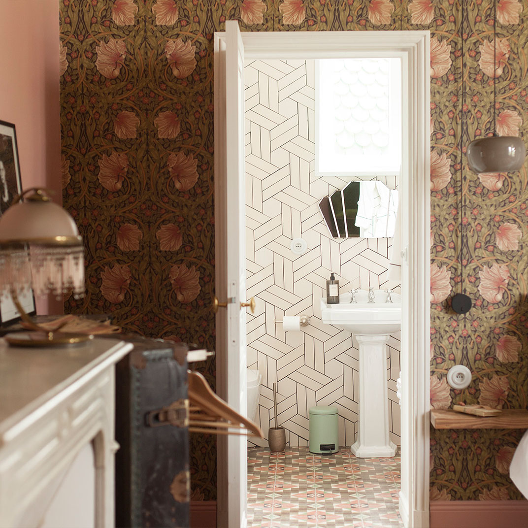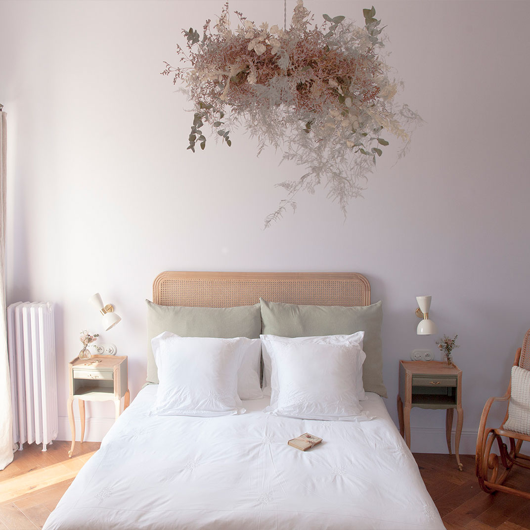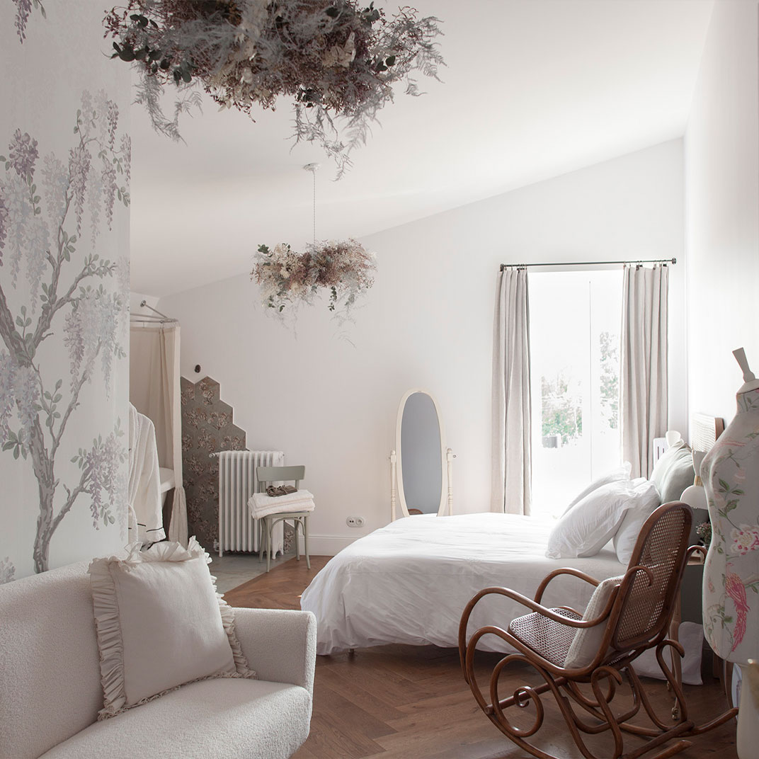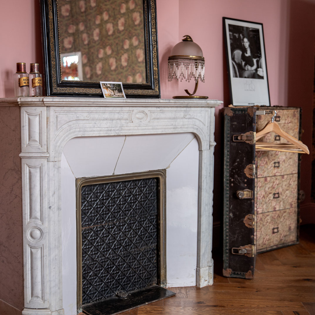 Quaint and rich with historic character after restorations by the new owners, the interiors are filled with romantic details: wisteria wallpaper by Laura Ashley, a wardrobe crafted out of an antique travel trunk, a mother-of-pearl chandelier, a cast-iron clawfoot tub. Two rooms incorporate the castle’s turrets, one repurposed into a reading room and the other into a boudoir, and all have views over the Canal du Midi.
