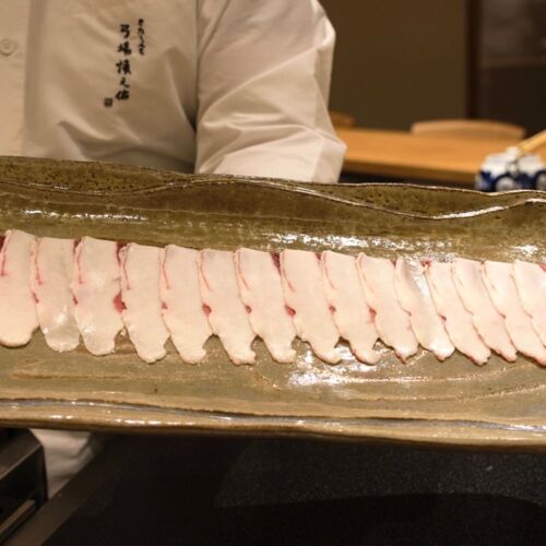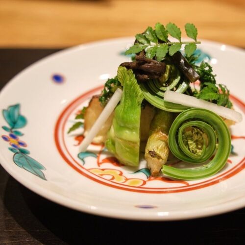 The owner-chef prizes nothing more than the temperature and aroma of his cooking. All dishes are prepared and served fresh, so counter seating is arranged around the preparation surface. In a twist, the sashimi is served with unconventional dressings such as nori seaweed soy sauce and monkfish liver with ponzu. Char-grilled beef and, in winter, shabu-shabu of bear and boar are prepared in front of customers. To finish, a selection of takikomi-gohan, rice seasoned with various ingredients, allows diners to enjoy comparing flavours.