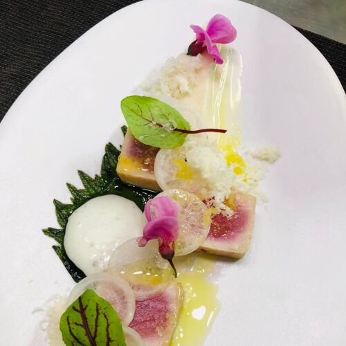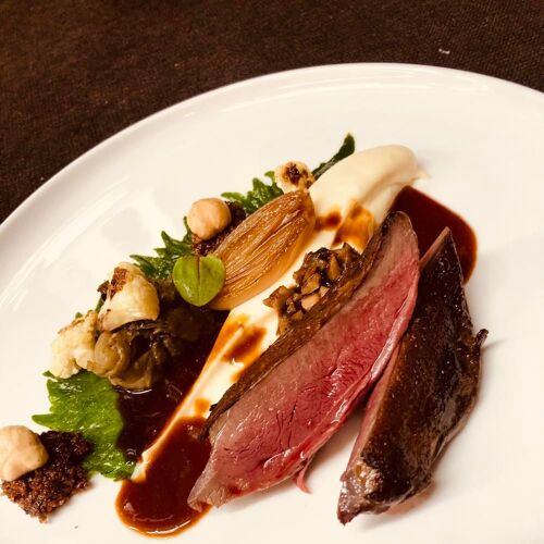 Nestling at the foot of a 14C tower in the heart of the famous wine-growing village, this traditional townhouse boasts an elegant, contemporary dining room offset by a scattering of period details (beams, ceiling and mouldings). Simplicity, authenticity and bags of character are the hallmarks of the food characterised by premium ingredients that keep pace with the seasons presented in an enticing lunchtime menu (that is also a steal!) and a surprise menu available in different versions in the evening. There is also an entirely vegetarian menu.