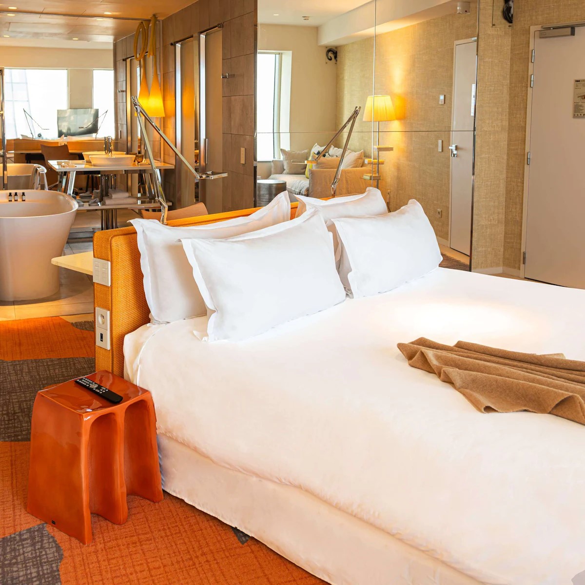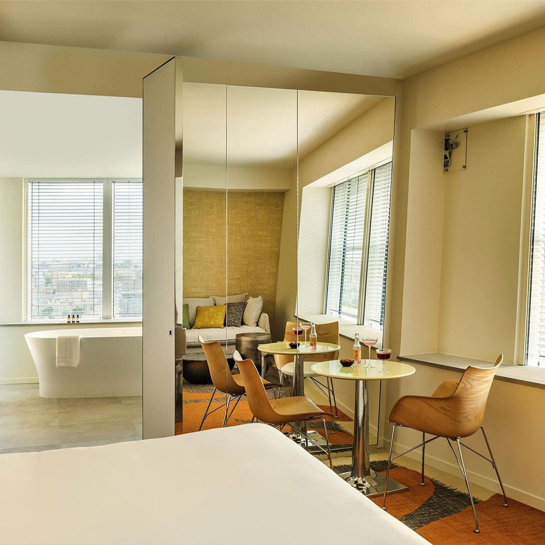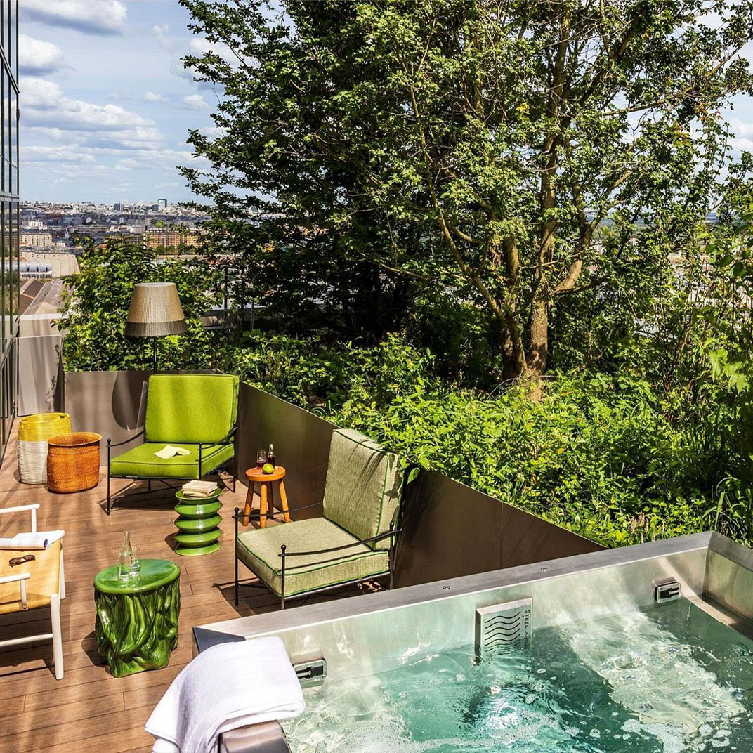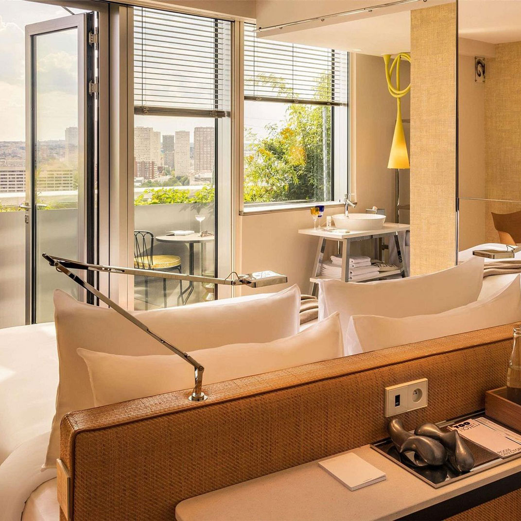 In almost every way, TOO Hotel departs from what you expect out of a Parisian lodging. It’s located not in the picturesque center but right on the edge of the city, across the road from Ivry-sur-Seine. And while Paris remains determinedly mid-rise, TOO Hotel’s elevation is unusual — it’s set atop Jean Nouvel’s Tours Duo skyscraper development, which explains why its views range all the way to the Eiffel Tower and beyond. The hotel’s interiors and artistic direction are by Philippe Starck, which means even aside from the setting it’s a memorable experience. A hip restaurant with panoramic views is joined by a roof terrace cocktail bar as well as a spa with a cedar sauna and an open-air Jacuzzi.