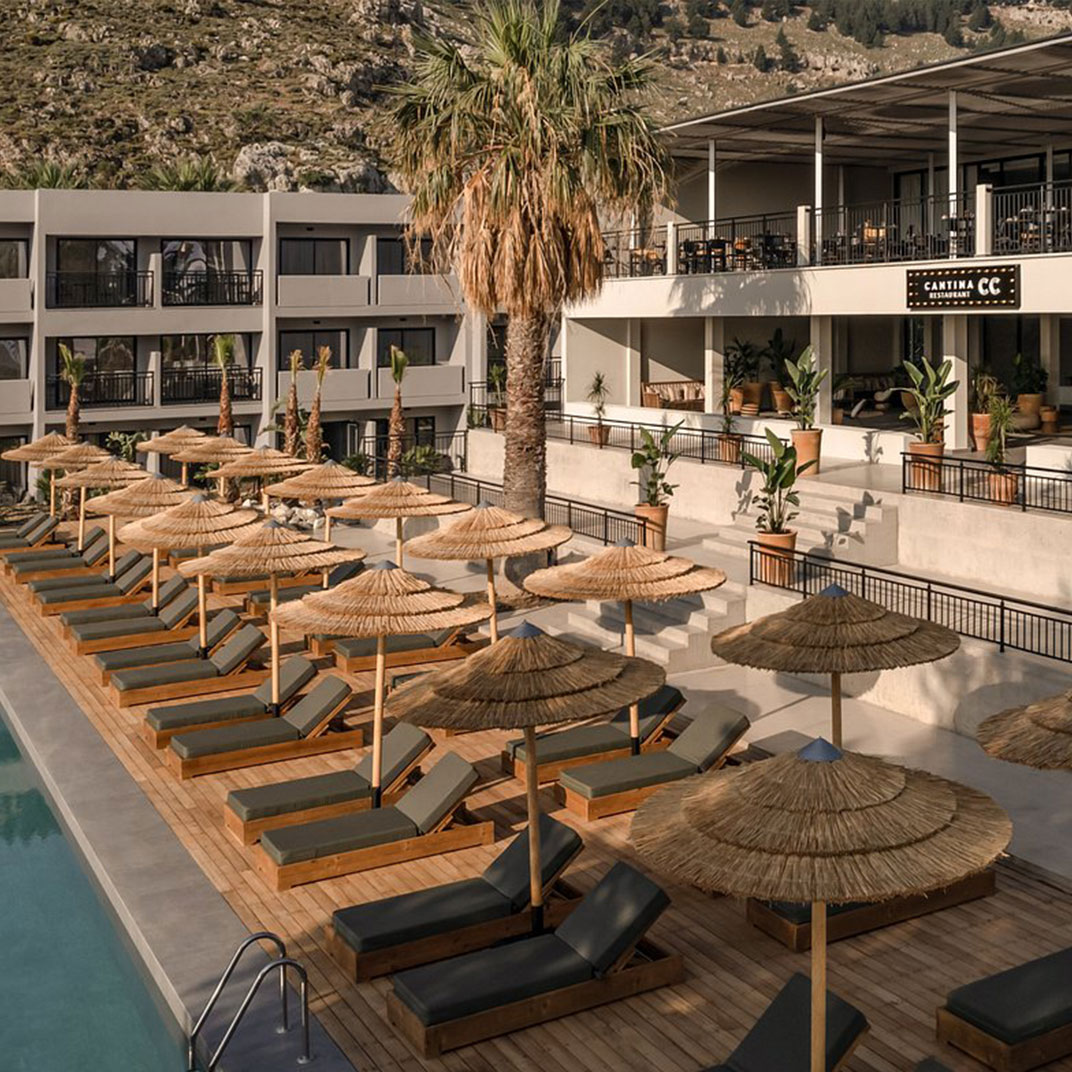 Cook’s Club Kolymbia brings a relaxed, adults-only spirit to the east coast of Rhodes. Its rooms are styled with earthy tones and boho details, while life outside centers around two pools framed by palms, loungers, and a resident DJ whose soundtrack shifts from laidback to lively as the day goes by. Food is a highlight, with Greek specialties, Italian dishes, Asian street food, and healthy bites all in rotation across the hotel’s three restaurants. Cocktails crafted by mixologists keep the social mood flowing, while Kolymbia’s sandy beach and nightlife are only a short stroll away.