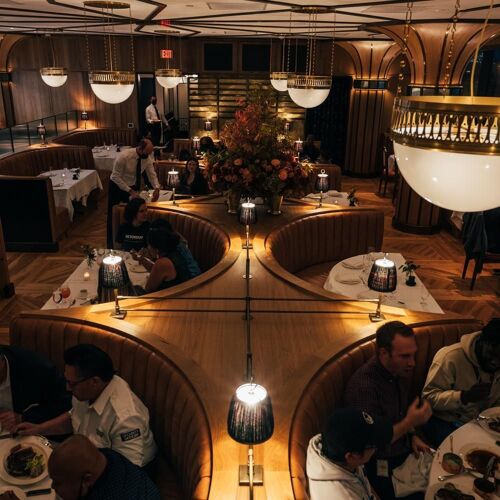 The elegant vintage-meets-modern design is an ideal setting to dress up and dine in comfort on a menu of steakhouse classics. Begin with a spot-on martini and superlatively fresh oysters (pulled from a saltwater "estuary" located in the kitchen). The Caesar salad and Dover sole meunière get an extra dose of charm, thanks to tableside service. Excellent dry-aged steaks (finished with barley, a healthier alternative for the animals and the planet), are seared to a deep mahogany and are the main event for good reason. Sides like creamed kale with crispy shallots also don't disappoint.