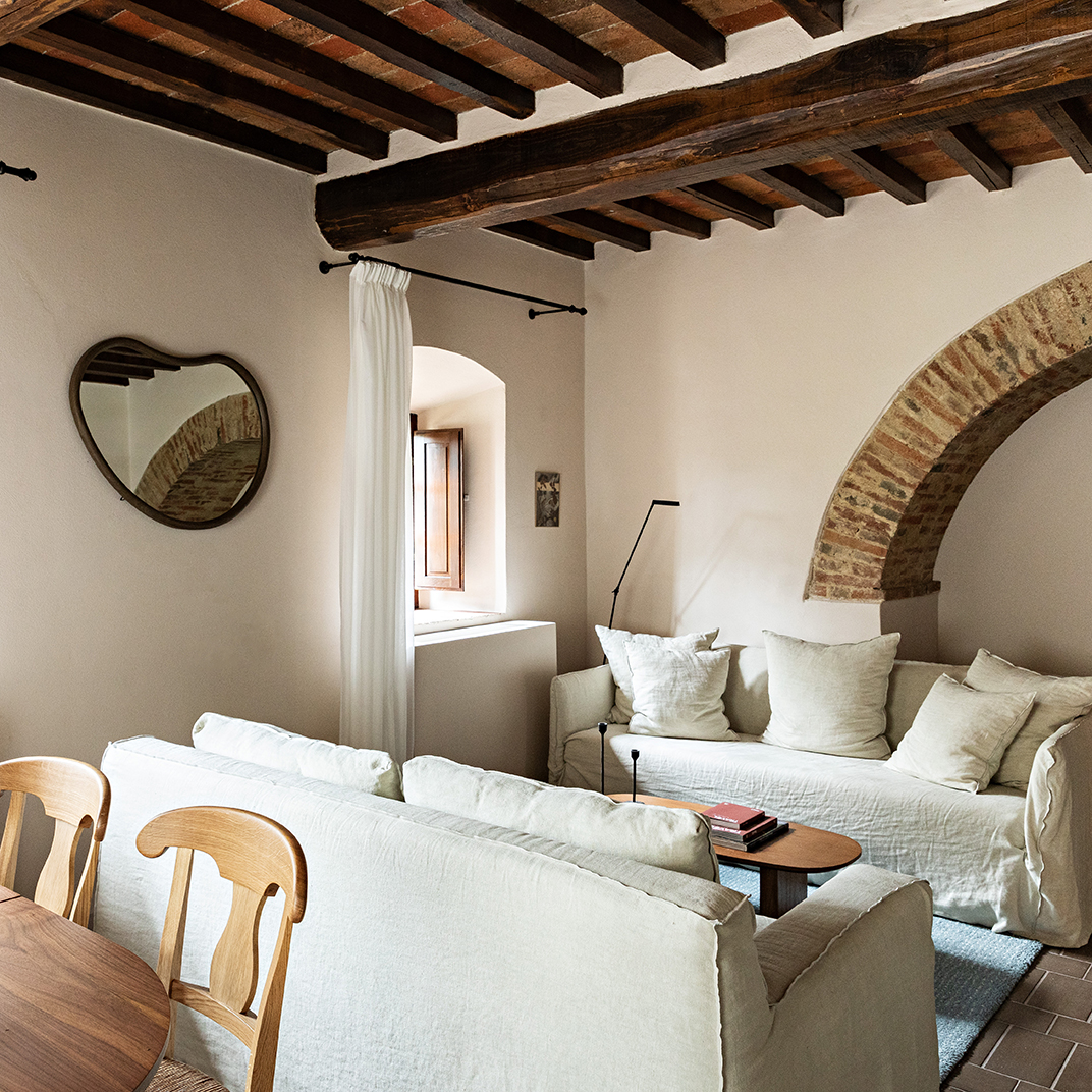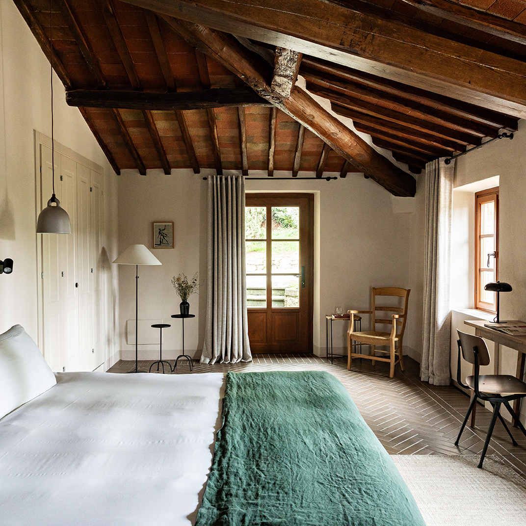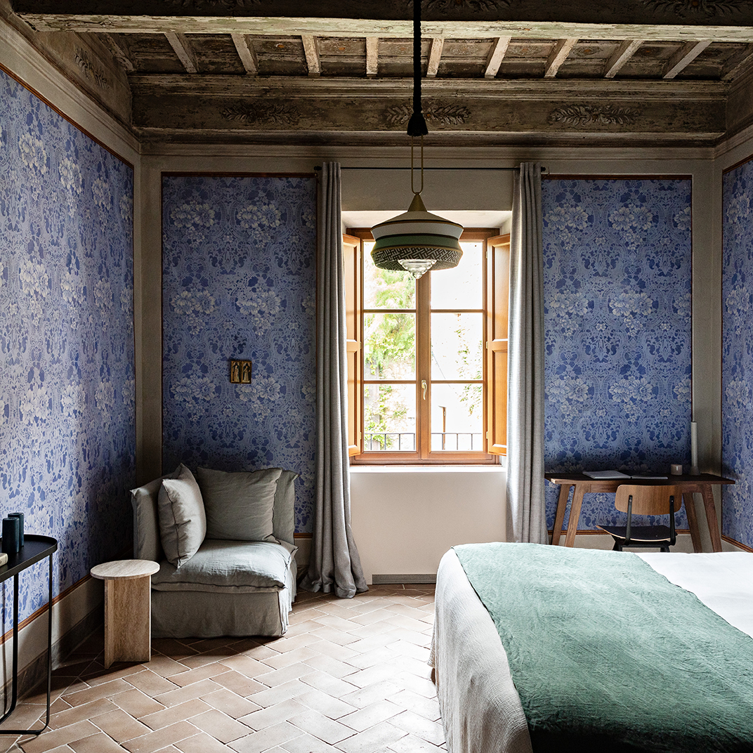 The 22 rooms and suites combine antique architecture and contemporary design, mixing rustic textures with 16th-century frescoes and a modern graphic sensibility. The accommodations are luxurious, but quietly so — not just soothingly simple in their visual style, but uncluttered and free of ostentatious ornament. Each unit is different, owing to the peculiarities of the historic floor plan, and many of the views are nothing short of extraordinary.