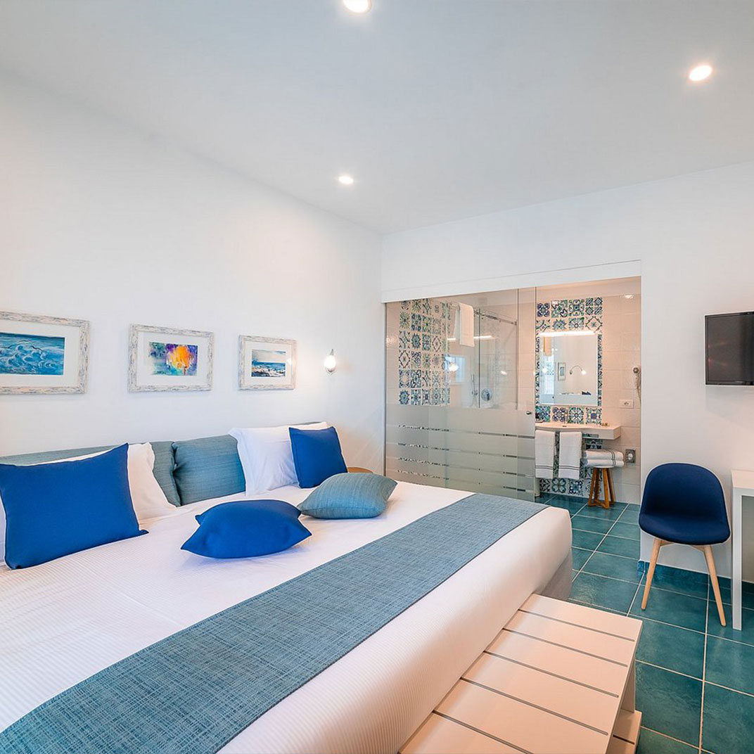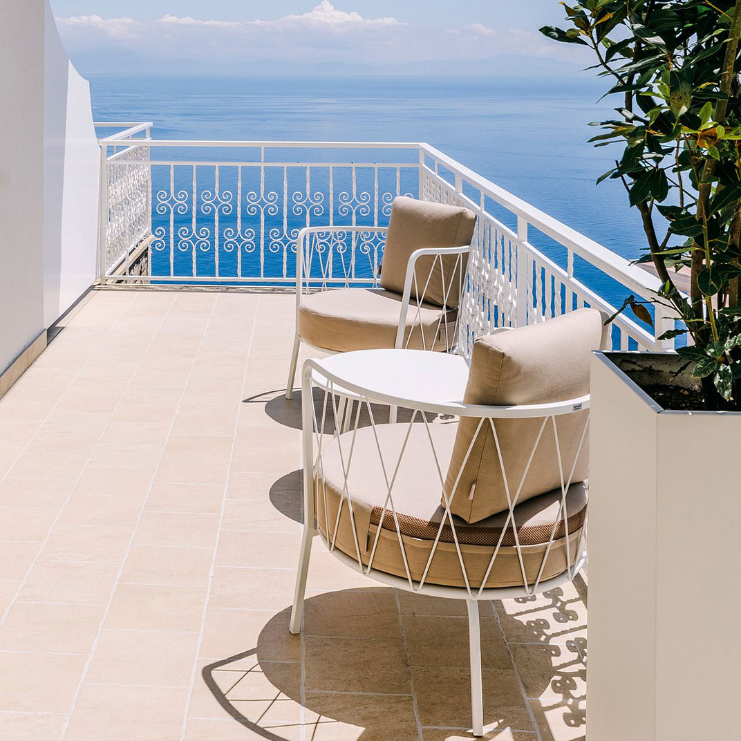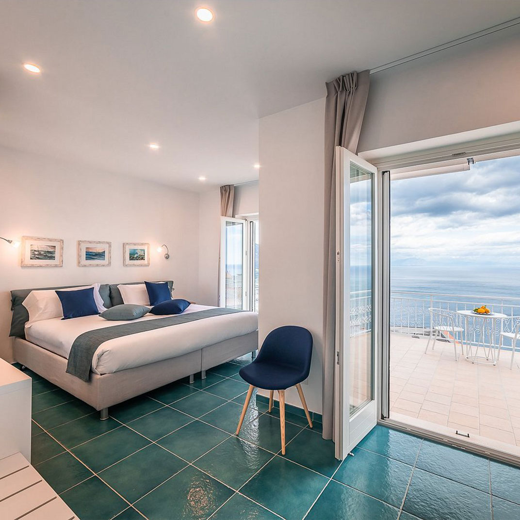 Perched above the Amalfi Coast, Casa Dolce Casa offers the serenity of Ravello with views that seem to drift straight into the sea. Its eight rooms are bright and inviting, dressed in handcrafted majolica tiles and warm Mediterranean colors. Some open onto private terraces made for long mornings or slow sunsets. A small wellness area adds to the sense of ease, while the solarium terrace brings together guests over the coast’s endless blue. Intimate, graceful, and unmistakably Ravello.