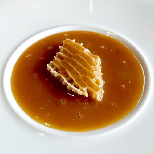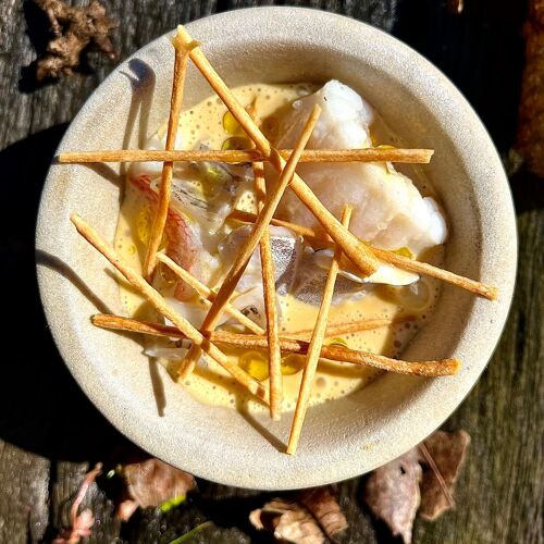 On the banks of the river Nalón, approximately 4 miles southwest of Oviedo, this colourful house occupies the premises of what was once L'Alezna, a restaurant that already shone with a MICHELIN Star between 2004 and 2008. Chef Pedro Martino, who has returned to his origins and has given his own name to the renovated business, seeks to bring Asturias to our palates, which is why every day, along with the appetising menu, he presents a menu called Orígenes Tradición (Origins Tradition) and another, more extensive and modern, called Orígenes Degustación (Origins Tasting) (the latter is a sequence of small bites where the chef, with great skill and care, brings the powerful flavours of yesteryear into the modern day). Which dishes caught our attention the most? There are several, such as the Caramietcha (pork cheek cured in salt), the Caldo de Pote (this stew was the predecessor of the famous fabada), the delicate onion stuffed with tuna and liquid yolk, the grilled wild turbot... It has a pleasant terrace and panoramic dining rooms!