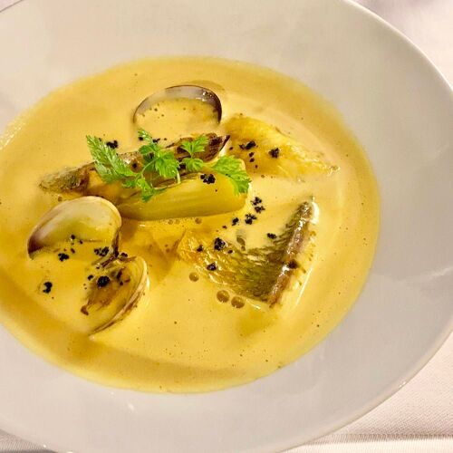 Opposite the sea and the ochre-coloured rocks of the Estérel mountains and looking down on the beach and port of La Figueirette, this restaurant was founded in the 1950s by a local fisherman. It has passed into the capable hands of Jérôme Cervera, a former fishmonger. The chef whips up a menu featuring ultra-fresh seafood and carefully crafted dishes, such as lightly seared red mullet served with fruity olive oil and seasonal vegetables. The attentive and bright service adds to your enjoyment of the meal. At lunch and dinner, an appealing set menu reprises dishes from the à la carte menu – tuck in on the terrace or in the pretty dining area with a sea view.