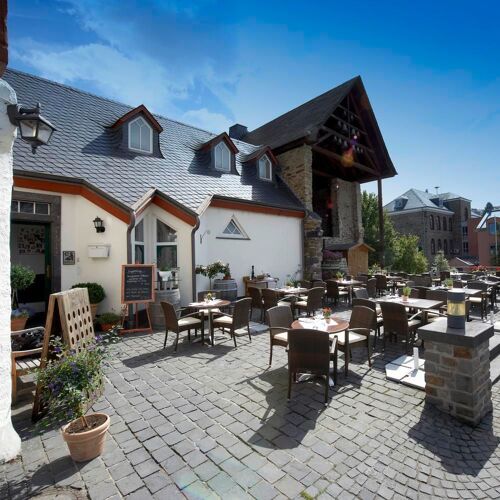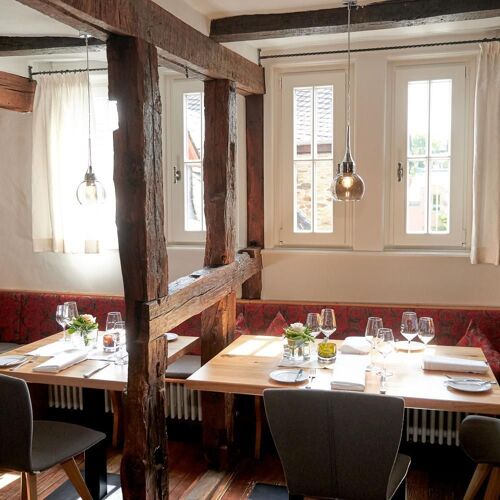 This gorgeous half-timbered house dating back to 1647 boasts a cosy interior with banquette seats and ambitious seasonal Mediterranean cuisine made from excellent ingredients. The terrace in front of the old barn with its glockenspiel clock is also very appealing. Tip: There is a public car park just around the corner.