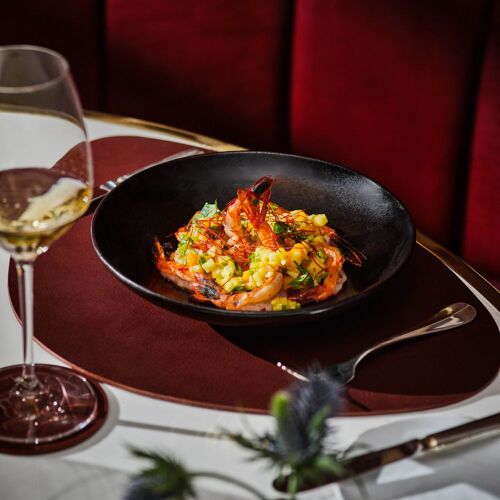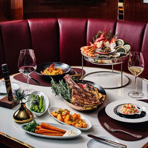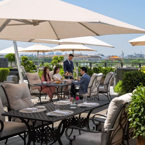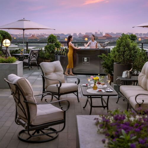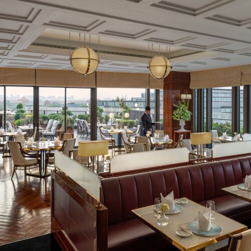 The beautiful dining room mimics a ‘brasserie de luxe’ of yesteryear. Tufted leather banquettes, polished wood details and crisp white linen promise a marvellous meal; consistently impeccable service is yet another highlight of the space. Choose from the classic grill menu with steaks from U.S. and Australia. An apéritif or digestif on the terrace that affords unrivalled views of the Forbidden City’s skyline and eaves makes for a wonderful experience.