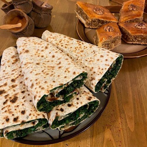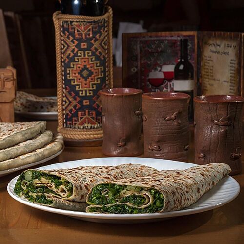 How many leafy greens and herbs can you name? At this minimally embellished Armenian bakery, watch as two seasoned chefs knead, roll out, and griddle a specialty flatbread stuffed with more than a dozen chopped varietals. It’s as if they’ve been doing this their entire lives, working with the likes of sorrel, spinach, scallions, and beet leaves to make a tight, forest-green lining that is at once sweet, sour, sharp, and refreshing.