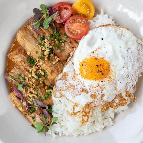 Keep an eye out for the neon pig above the door of this modern Filipino comfort food spot—think of it as a porcine portent of things to come. Inside, the vibe is family-friendly and casual with a mix of aluminum and wooden tables set with bamboo and metal chairs.