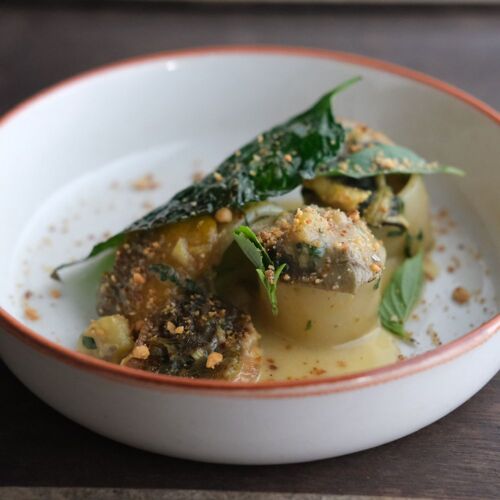This al fresco Italian dining spot is known for its daily catch. The chef's passion for fish shines through in his fresh, seasonal dishes, served in five- or eight-course set menus or à la carte. With soft lighting for a romantic atmosphere, the establishment occupies two floors, with a bar downstairs and the dining room upstairs. The paintings on the walls, by local artists, are available for purchase. The wine pairings complete the experience.