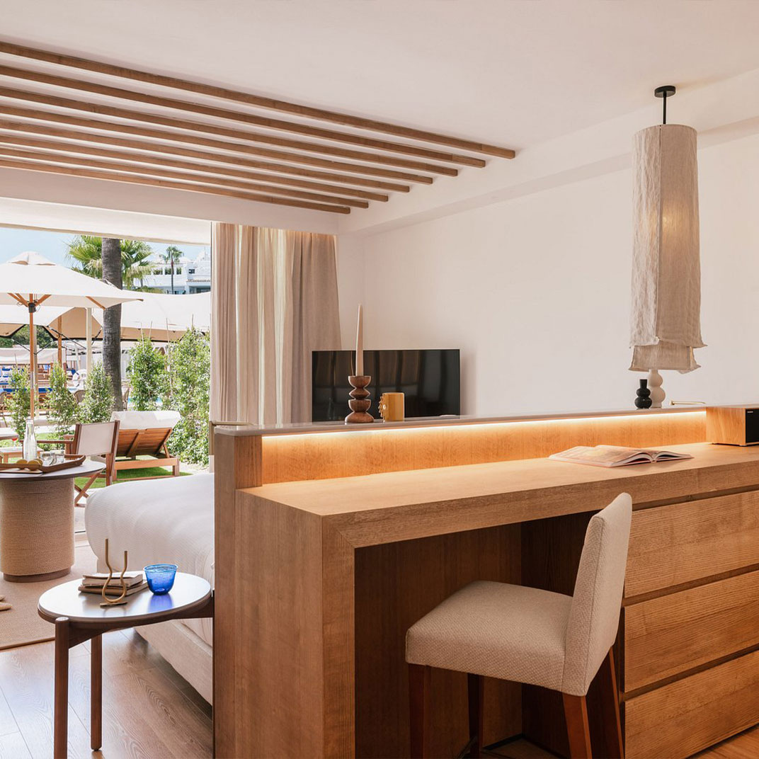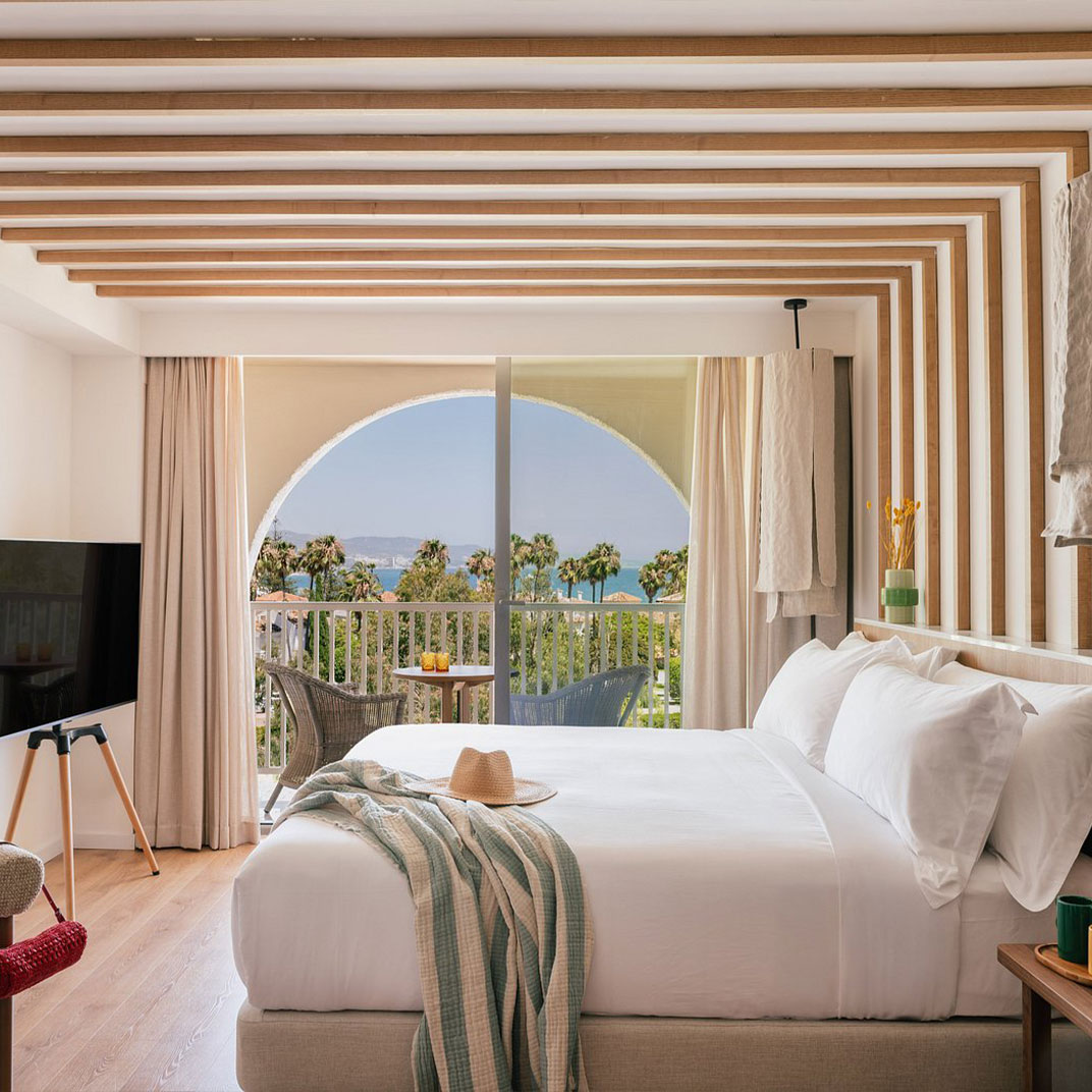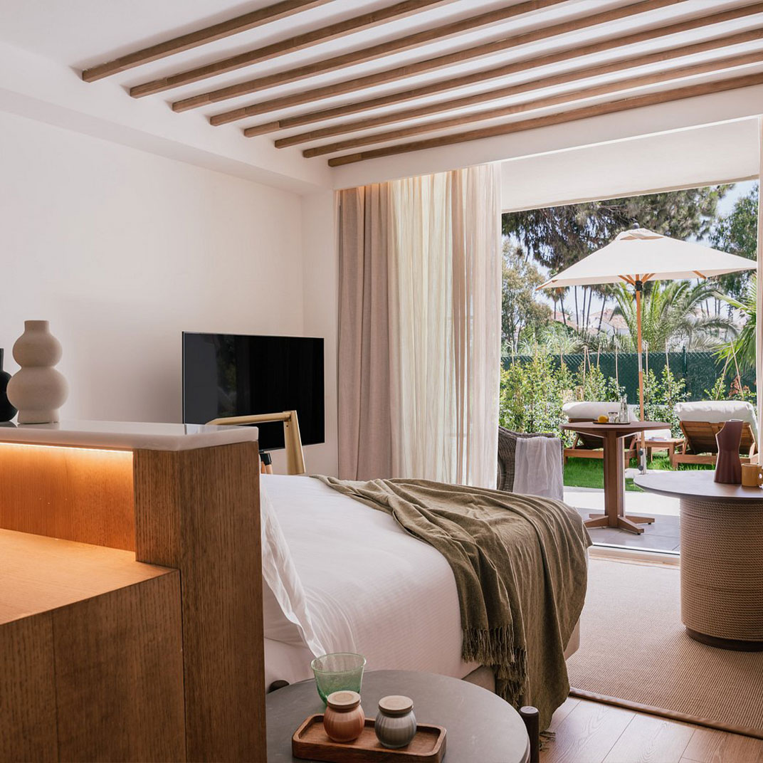 ME Marbella launched in 2025 as the ME by Meliá brand's first property in Andalusia. ASAH Studio handled the interiors, working with lime, stone, and sea-blue plaster in shapes that feel organic rather than structured. There are 200 rooms total, including 24 suites and penthouses, some with private pools. Oasis is an indoor beach club with a DJ booth and year-round climate control, functioning as the hotel's social center. Three restaurants focus on wood-fired cooking and local produce. The ME+ program offers experiences that go deeper than typical concierge services: private visits to artist studios, underwater wine tastings, and electric-boat trips along the coast.