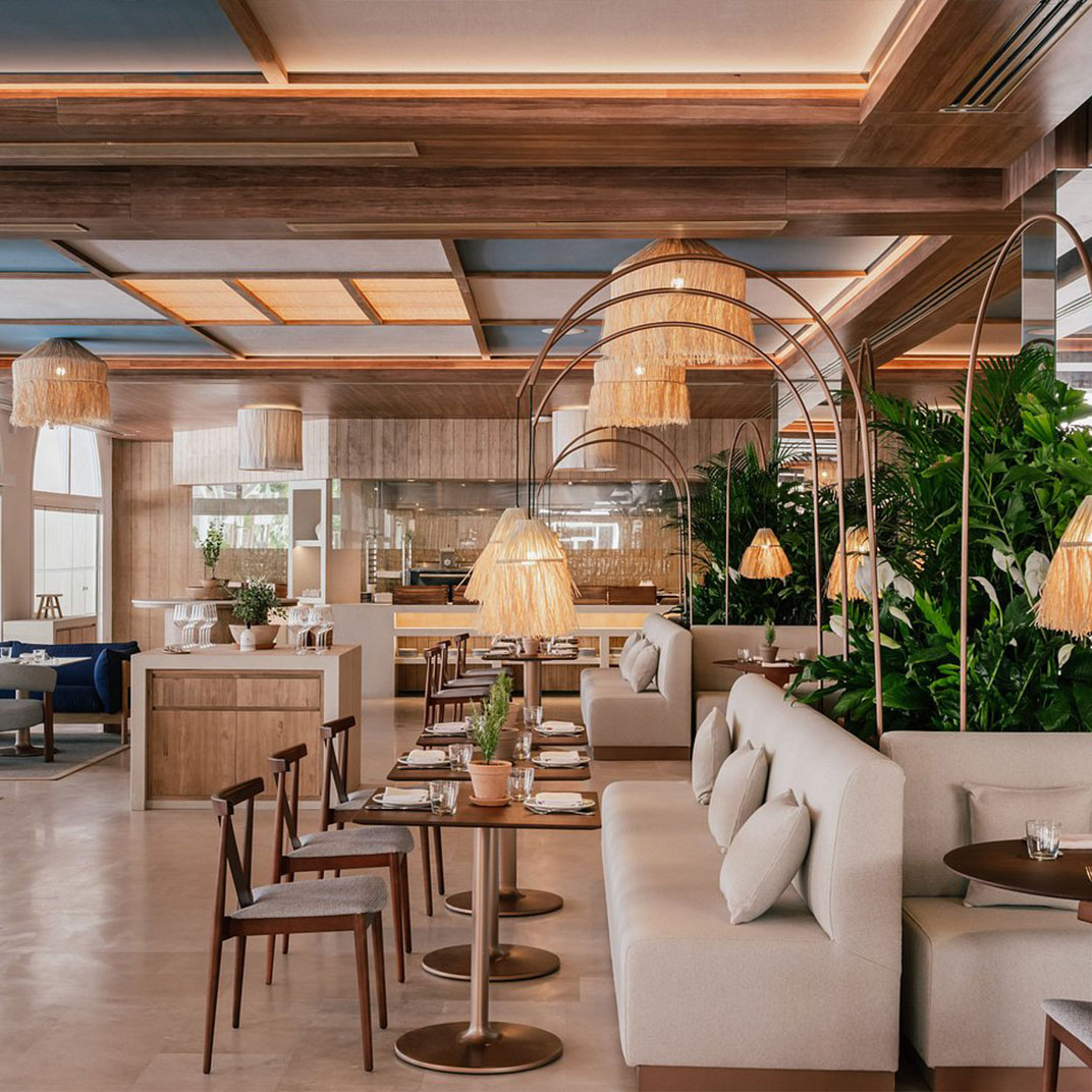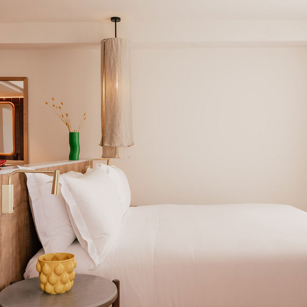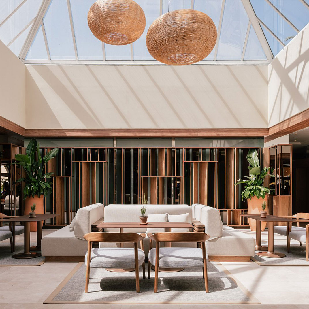 ME Marbella launched in 2025 as the ME by Meliá brand's first property in Andalusia. ASAH Studio handled the interiors, working with lime, stone, and sea-blue plaster in shapes that feel organic rather than structured. There are 200 rooms total, including 24 suites and penthouses, some with private pools. Oasis is an indoor beach club with a DJ booth and year-round climate control, functioning as the hotel's social center. Three restaurants focus on wood-fired cooking and local produce. The ME+ program offers experiences that go deeper than typical concierge services: private visits to artist studios, underwater wine tastings, and electric-boat trips along the coast.