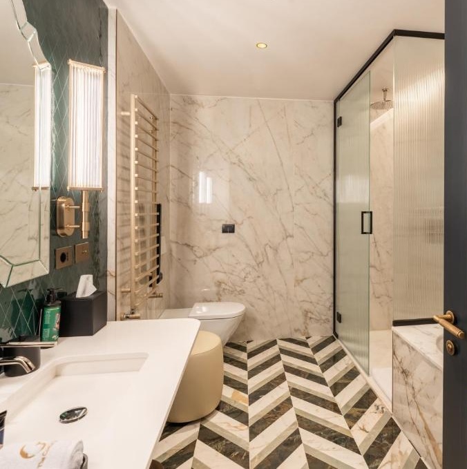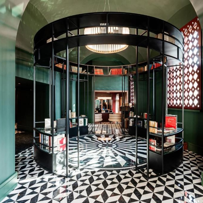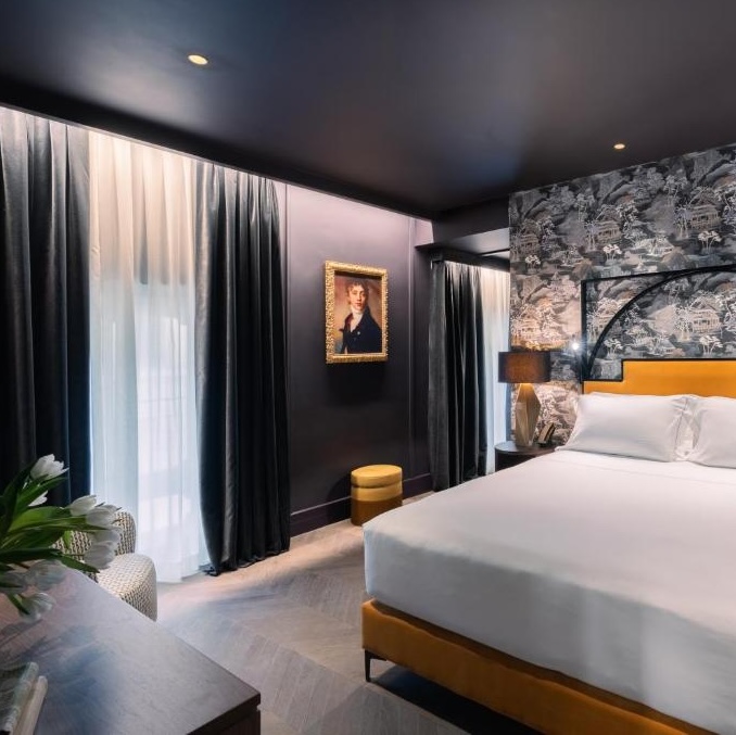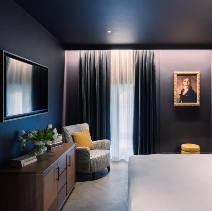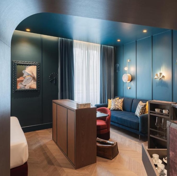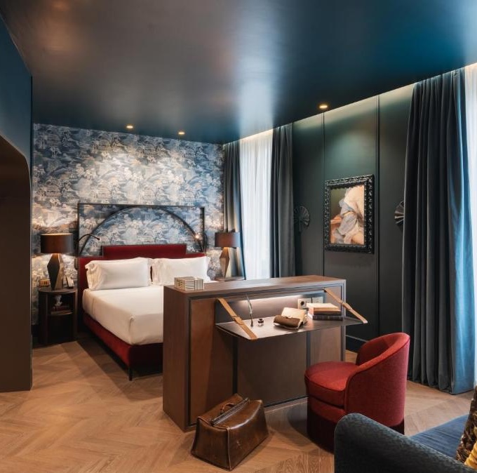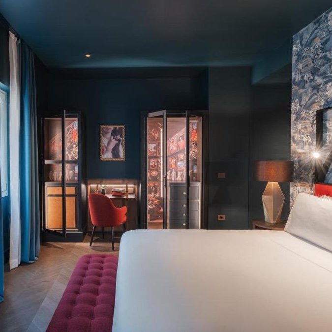 Housed in a restored palazzo near Piazza del Popolo, The Goethe Hotel takes its cues from Johann Wolfgang von Goethe’s “Italian Journey.” The interiors lean into atmosphere: burgundy and blue walls, vintage maps, velvet curtains, and shelves stacked with books and curiosities. Even the smallest rooms come with sitting areas, while patterned headboards and framed prints add personality. Bathrooms are tiled in jewel tones with double showers and ETRO products. Affinity restaurant serves modern Italian dishes, with the city’s cobbled streets and boutiques just outside the door.