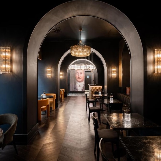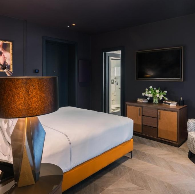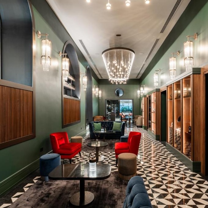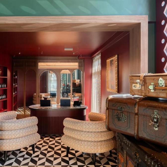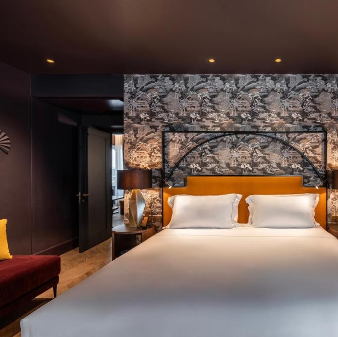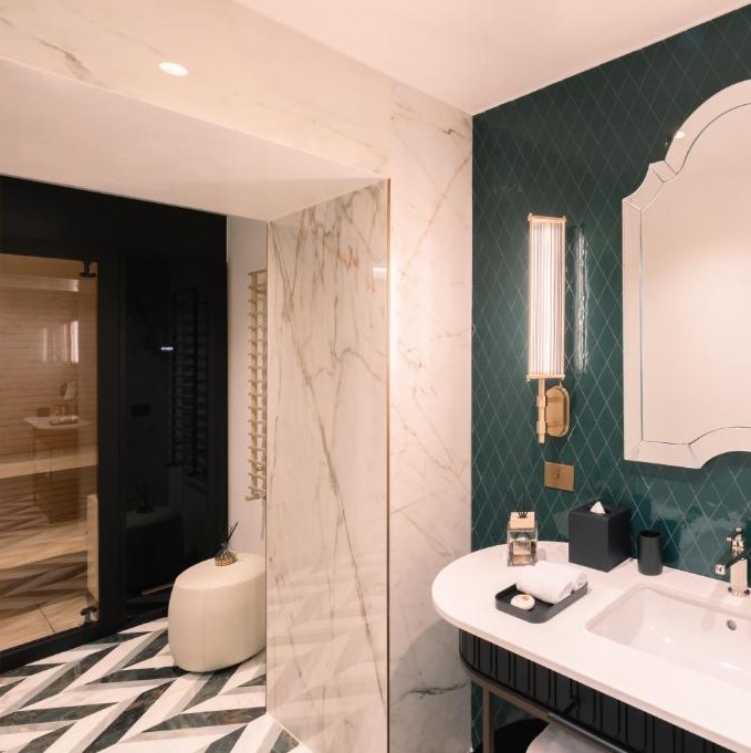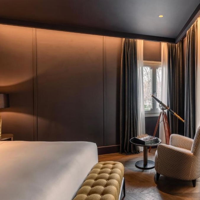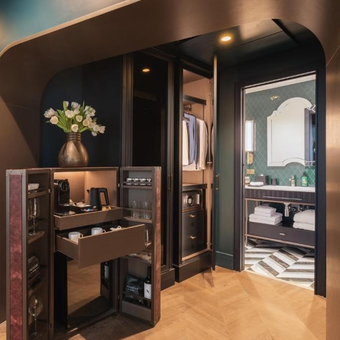 Housed in a restored palazzo near Piazza del Popolo, The Goethe Hotel takes its cues from Johann Wolfgang von Goethe’s “Italian Journey.” The interiors lean into atmosphere: burgundy and blue walls, vintage maps, velvet curtains, and shelves stacked with books and curiosities. Even the smallest rooms come with sitting areas, while patterned headboards and framed prints add personality. Bathrooms are tiled in jewel tones with double showers and ETRO products. Affinity restaurant serves modern Italian dishes, with the city’s cobbled streets and boutiques just outside the door.