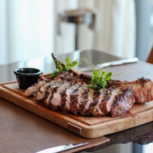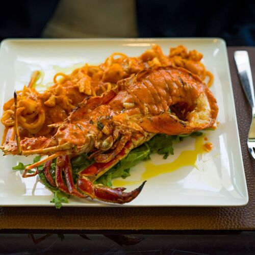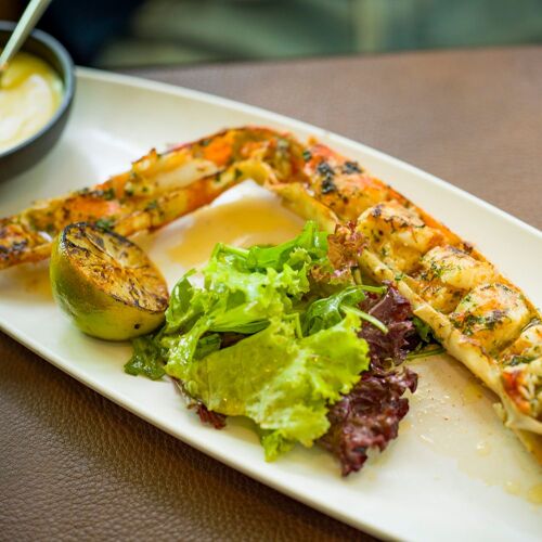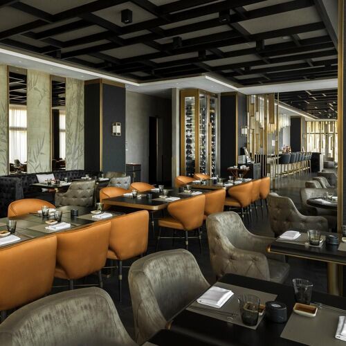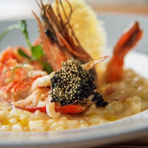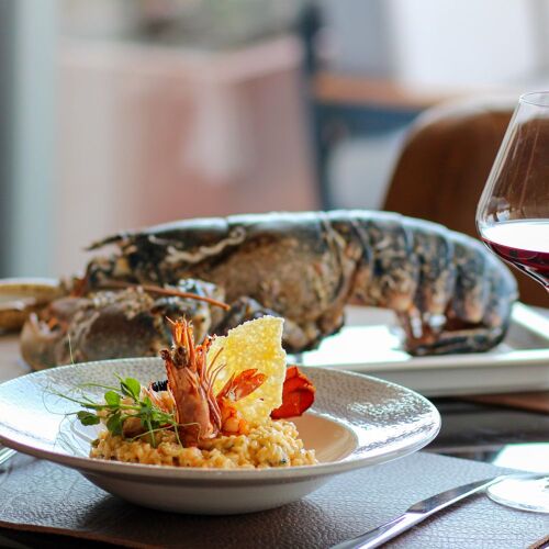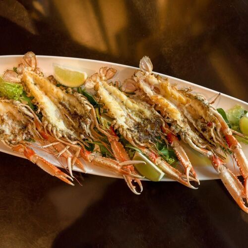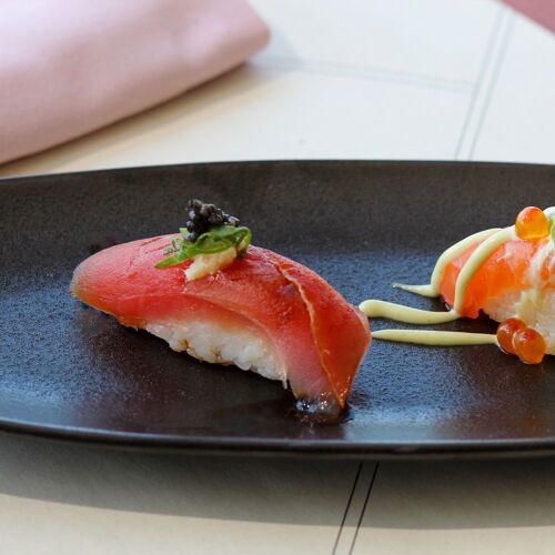On the eighth floor of the Hilton hotel, the elegant dining room perfectly embodies the refined, international atmosphere one would expect in such a setting, enhanced by soft lighting and gentle music. The menu, too, has a global flair: Asian-inspired dishes such as Tom Yum soup, Gyoza dumplings, and a wide selection of nigiri, sashimi, and maki rolls. There’s also room for simpler and occasionally Mediterranean preparations—both meat and fish—presented tableside from a trolley, along with crab, lobster, and a selection of fresh salads.