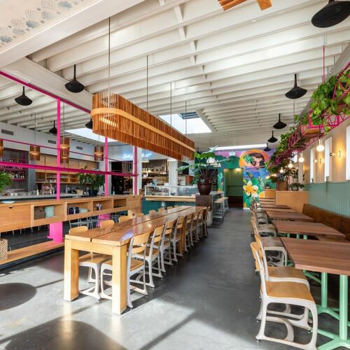 Stroll into this lush, happening spot and your eyes will quickly fall on neon blue letters scrawled above the lively open kitchen: "did you eat yet?" The correct answer is "no": an empty stomach will be amply rewarded by the vibrantly flavorful cooking here. Southeast Asian flavors find unique Californian expressions in dishes like a signature adobo-glazed fried chicken wing stuffed with garlic rice, or a Lao-style sausage with tangy pasilla pepper jaew. A version of halo halo, featuring mango jellies, shiso shaved ice and seasonal fruit, is a particular treat. Reservations go quickly, but if you walk in early (or late), you may find a perch to dine at the bar, where you'll also find an array of creative, tropically inflected cocktails—a match made in paradise.