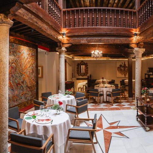Este restaurante, un clásico del centro histórico toledano dotado con un precioso patio-comedor del s. XII, toma un nuevo rumbo bajo la dirección de los hijos del propietario, el emblemático Adolfo Muñoz. La propuesta se concreta en un único menú degustación de temporada que trabaja mucho con hierbas y verduras procedentes de su propio cigarral. En conjunto, es una cocina sana, sabrosa y respetuosa con la tradición, pero vista desde una mirada más actual (encontrarás platos como los Espárragos verdes" Bio" de Camuñas, cúrcuma y trufa negra Melanosporum o el Lechón, su jugo y compotas de fruta). ¡Completa la experiencia visitando su fantástica bodega subterránea!