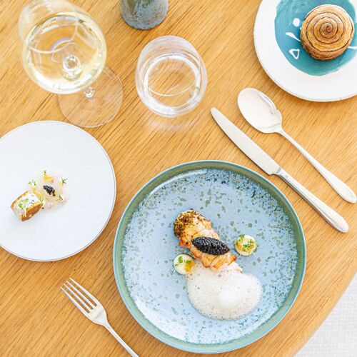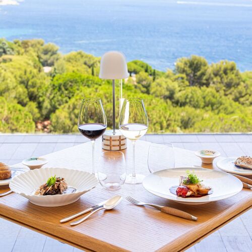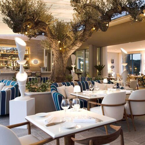 This exclusive luxury hotel, which blends seamlessly into its natural surroundings, is the HQ of talented Éric Canino, a chef influenced by his fruitful collaboration with Michel Guérard. Inspired by the master of healthy cuisine, Éric composes his own Provençal score, with fruit and vegetables, fish and seafood (plus some poultry), enhanced with aromatic herbs and olive oil. His culinary scope is phenomenal, ranging as it does from a modern use of citrus fruits to textbook perfect sauces and reductions that add character and depth to each dish. His red mullet poached in seawater (one of the chef’s favourite cooking methods), paired with crushed tomatoes and citrus fruits and escorted by a truly superlative reduction of fish heads, is emblematic of this virtuoso chef. Consummate pastry chef Julien Coulomb (stints at le Cinq and Plénitude with Maxime Frédéric) signs creations stamped with delicate subtlety, such as his strawberry and rhubarb delight.