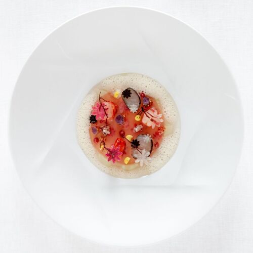 Zilte strives to offer a global emotional experience, starting with the view of the city skyline from the top floor of the Museum aan de Stroom. The understated designer interior is elegant and cosy, offset by the chef’s old record player which adds a nostalgic jazzy note. Everything is spot on from the gracious welcome and the wine waiter’s savvy tips to the sweet treats served with coffee. Viki Geunes has stripped his restaurant of everything but the essentials, starting with outstanding quality ingredients as he harnesses his creative flair to make each dish a masterpiece of excellence. For example, Geunes may add a tempura of sea urchin, thinly sliced hearts of palm, cream of celery and an unusual mandarin-flavoured miso to immaculately cooked langoustine. He may then also craft a second dish with the same ingredients, surprising us with a whole new repertory of textures. This fastidiously meticulous chef delicately plays with each texture and flavour, conjuring up food that is complex and gutsy, yet free of fussy frills. Now add sauces to die for and exotic side dishes with a surprising, yet mild spicy note and the portrait of Viki Geunes’ consummate skill and talent is complete.