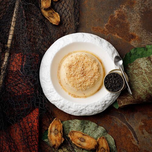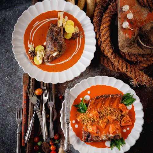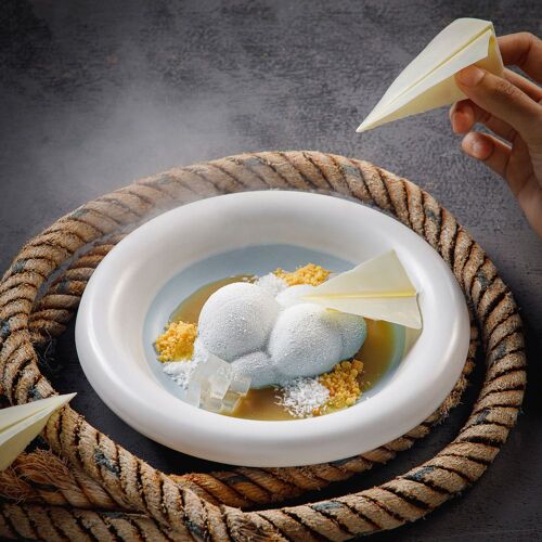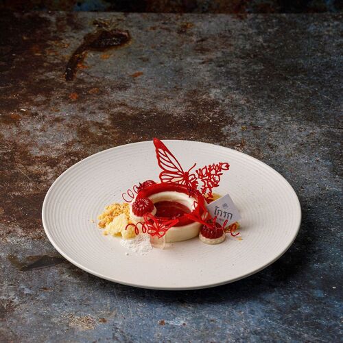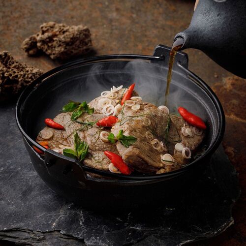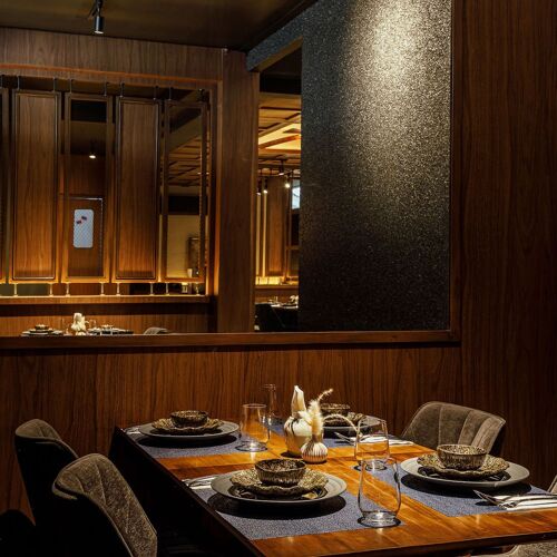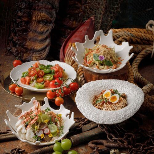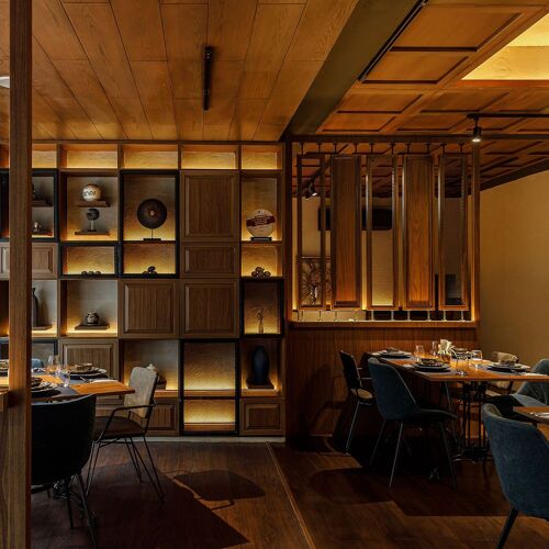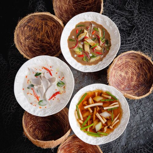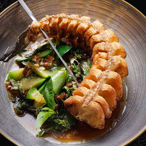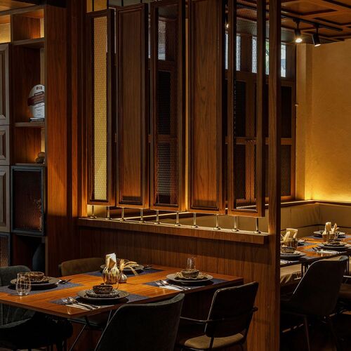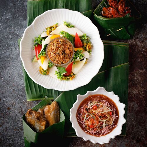 The interior, decorated in elegant dark tones with wood-clad walls, creates a nostalgic ambiance. The menu offers a modern take on Ratchaburi cuisine, where the intense flavours and aromas of each dish pair well with Thai herbs. The duck confit with red curry and the stir-fried minced chicken thigh with Thai herbs and five peppercorns are recommended.