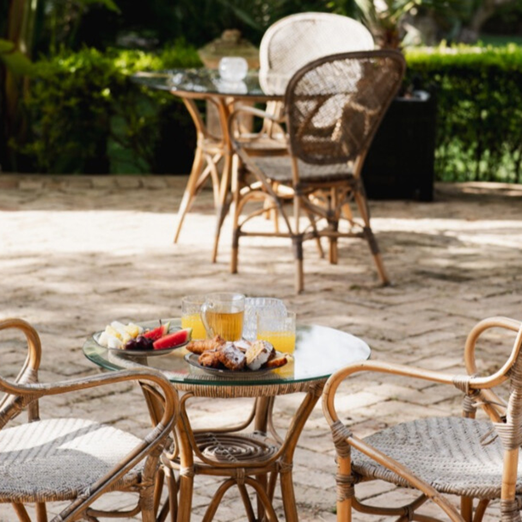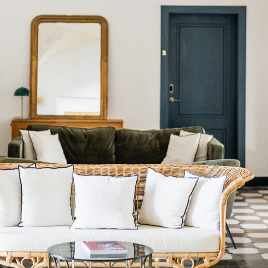 Its 21 rooms and suites span several buildings, from the main house to the barn and various outbuildings, whose architecture is a vibrant mix of Spanish and Moorish influences. Every one is a bit different, owing to the irregular floor plans of these converted structures, but they’re all handsomely styled in focused, contemporary colors, and outfitted with rattan furniture and upscale boutique-hotel comforts.