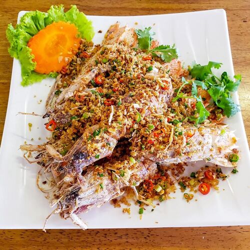 Located near Rawai Beach, Mook Manee stands out for its array of live seafood for diners to choose from, including squid, tiger prawns, a variety of crabs, and 3kg Phuket rainbow lobster. The restaurant holds up to 300, but the best seats offer views of the vibrant seafood market trading outside. Menu highlights include the fragrant stir-fried clams with chilli paste. A wooden terrace on the beach is also available.