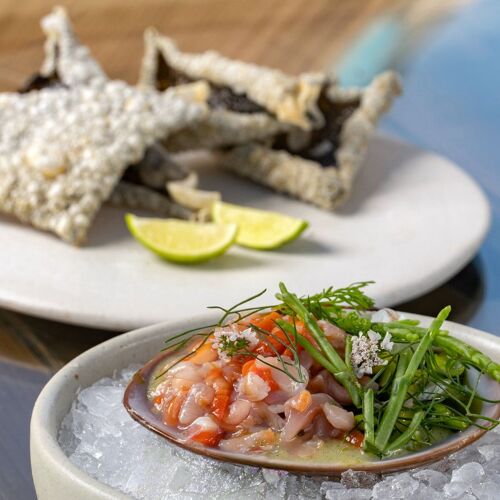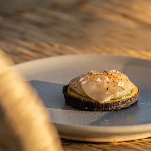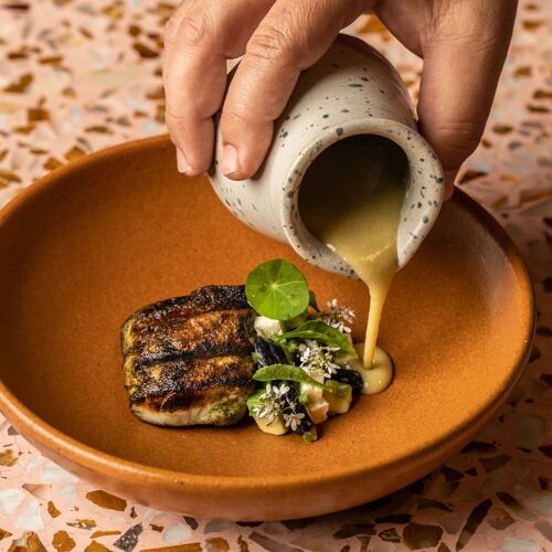 "Our monthly tasting menu is crafted from locally-sourced, seasonal produce, mainly from our own farm, vegetable garden, animal pen and apiary. All our dairy products are produced in-house. The seafood comes from local suppliers who ensure traceability and sustainability. We champion local viticulture with an exclusive 100% local wine list. We strive in waste management—separating, recycling, and composting—to enrich our garden and vineyard."