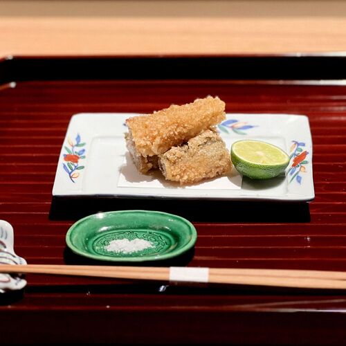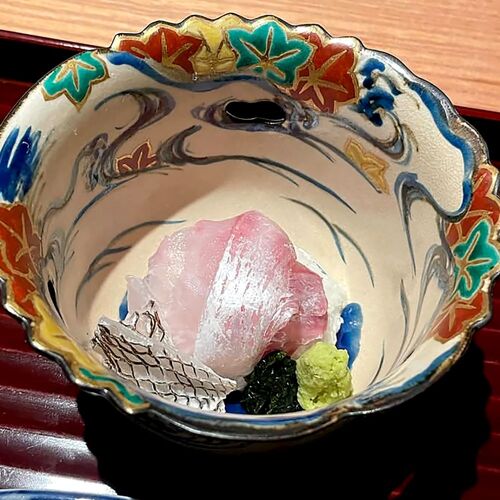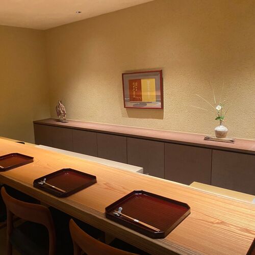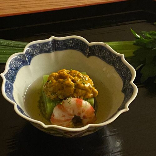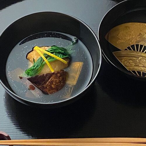 Japanese decor with Scandinavian chairs creates a harmonious modern Japanese interior. The chef respects the boundaries of Japanese cuisine while overlaying some creative touches. Tsukuri are dressed with salted kombu, enhancing umami. Tofu skin is grated and incorporated into pureed soup, coaxing out its sweetness. Pairing of fish and vegetables with fruit adds a lightness for a modern sensibility. Ingenious, yet true to the native flavours of the ingredients.