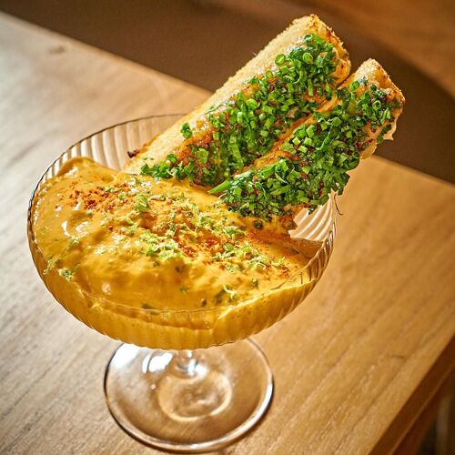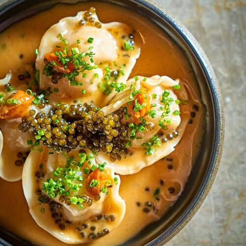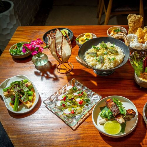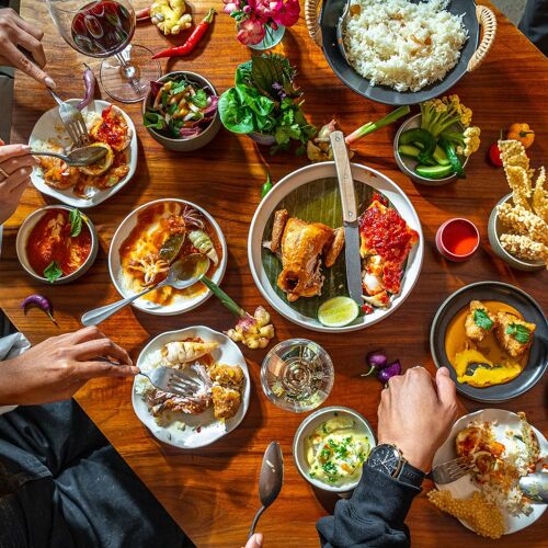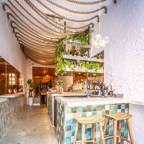 This comforting charmer honors the communal dining traditions of Indonesia’s West Sumatra. Thick, knotted ropes hang overhead in a narrow, intimate room fit with white brick and a tiled wall that nearly looks like white seashells. Chef Cedric Vongerichten delivers a verifiable feast served in little bowls and plates that fill every inch of space on the table. With the exception of your entrée, there are no choices to make for this easy prix fixe. The entirety of the meal lands all at once, allowing diners to bounce between fluke sashimi dressed in a light sambal hijau, crispy sweetbreads sitting in a gulai curry, and egg balado with Thai basil. Pickles, garlic rice and crisp tapioca crackers also dot the table.
