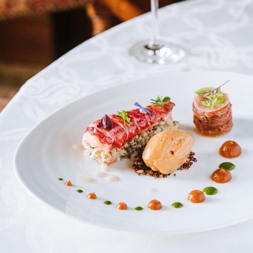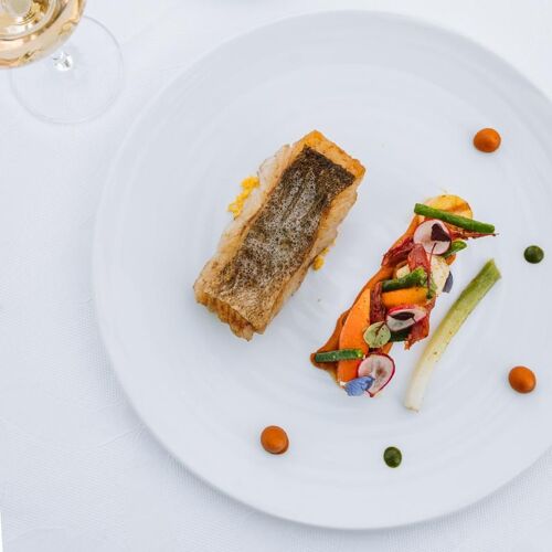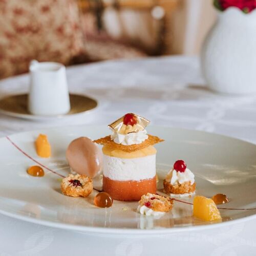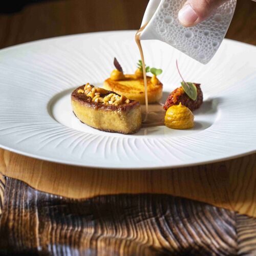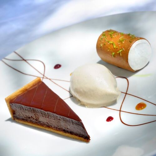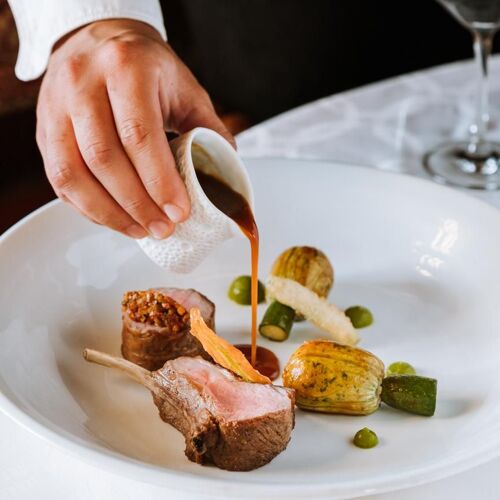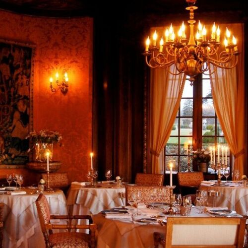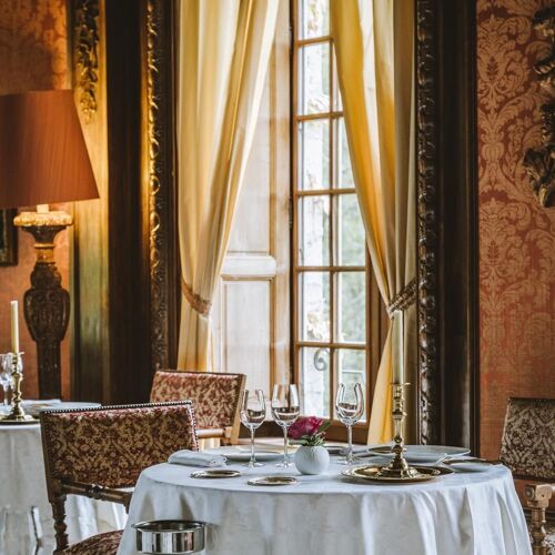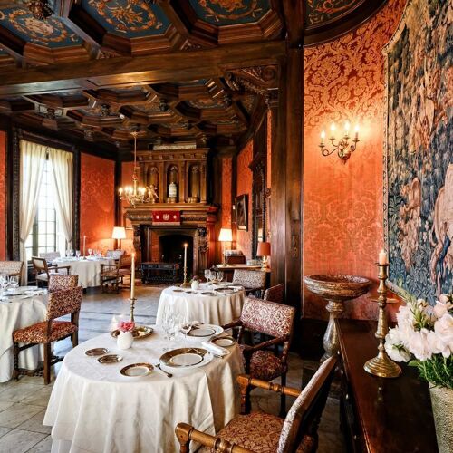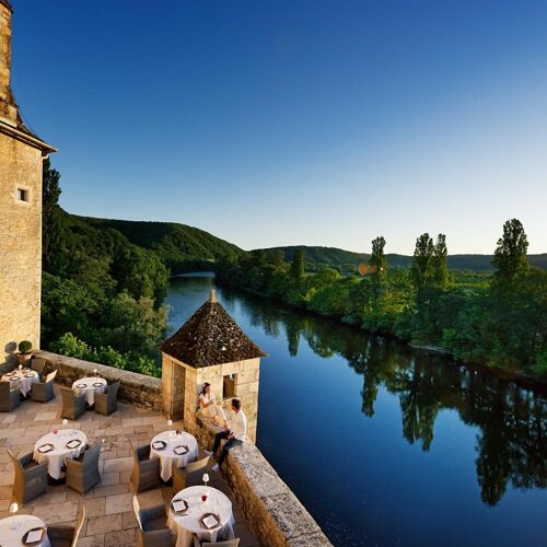 What a splendid spot! The River Dordogne meanders at the foot of this superb château set in a formal garden and grounds. The panoramic view from the terrace will take your breath away. The dining room is similarly stunning: marble floors, wall hangings, coffered ceiling and carved wooden fireplace. Stéphane Andrieux has been running the show for almost 25 years, rolling out a polished culinary lineup. Examples include roast Quercy lamb (fillet and rack), flanked with carrot tortellini and soy seasoning or a delicate shortbread of strawberry and meadowsweet, signed Marc Jean, house pastry chef since 1995.