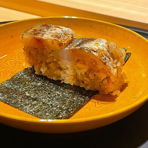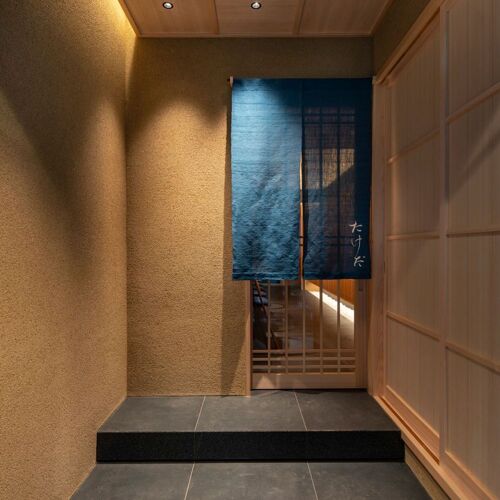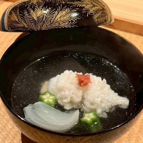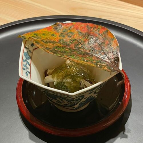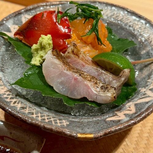 Indigo-dyed norens are a traditional craft of Tokushima. Indigo blue is the keynote colour of chairs and trays as well, symbolising Tokushima and declaring the chef’s birthplace. Seafood arrives from fishermen in Naruto and Minami. Vegetables and soy sauce are also specially sourced, and the brand-name citrus fruit is a point of pride. Soba-gome jiru porridge is hometown cooking prepared with buckwheat seeds and vegetables. Be sure to try the Nyumen, made with Handa somen. In Osaka, the city of the chef’s apprenticeship, he showcases the charms of his hometown.