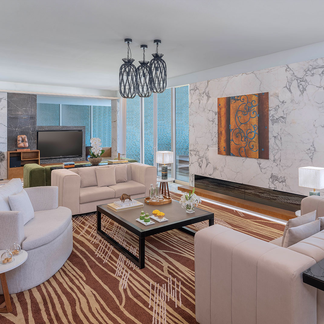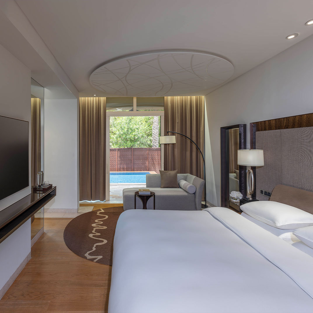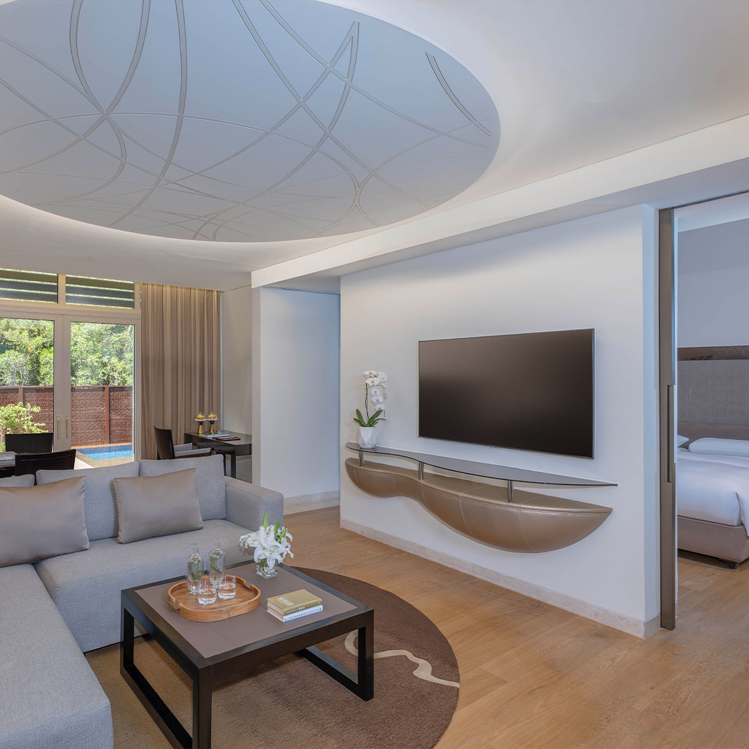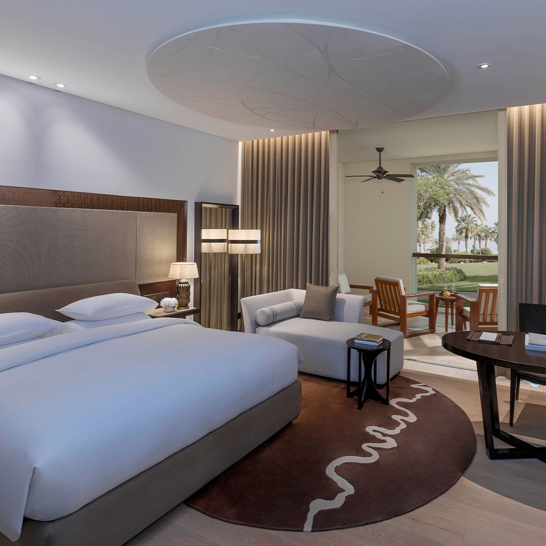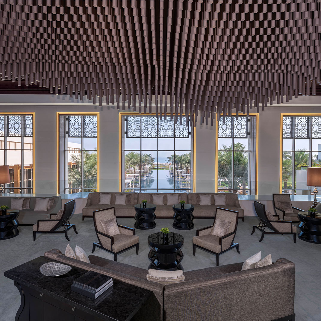 First of all, it’s not every day that you find a high-end hotelier — especially in the Emirates — that’s so devoted to tasteful restraint. The Park Hyatt Abu Dhabi isn’t exactly a wallflower or a shrinking violet, but considering it’s got over three hundred rooms, this sprawling mid-rise complex keeps a relatively low profile. (Low impact, too, meeting LEED Silver environmental standards.) And while the rooms, suites and villas certainly don’t lack for any comfort, when it comes to the design they’re so restrained you might just about forget where you are — until, if you’re in a Sea View room, a suite, or a villa, you open the blinds and take in a jaw-dropping view of the beach and the waters of the Arabian Gulf.