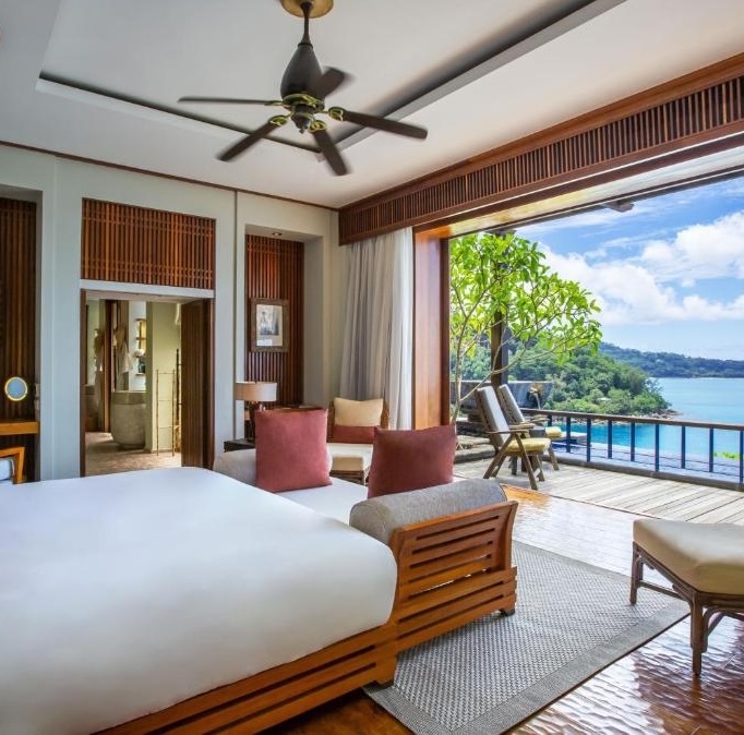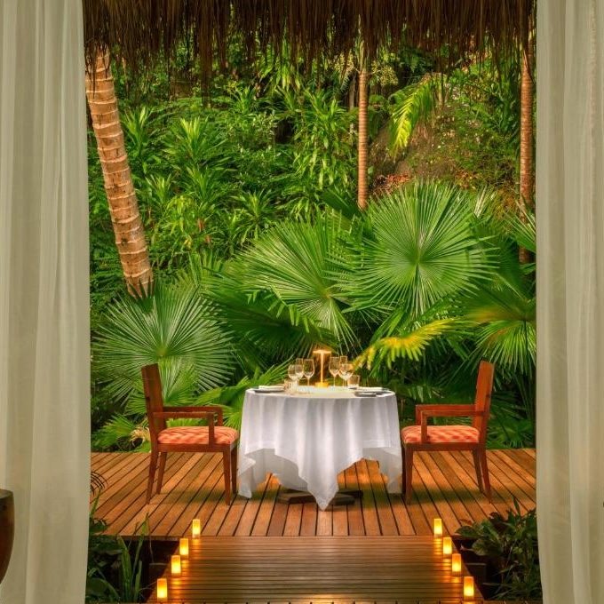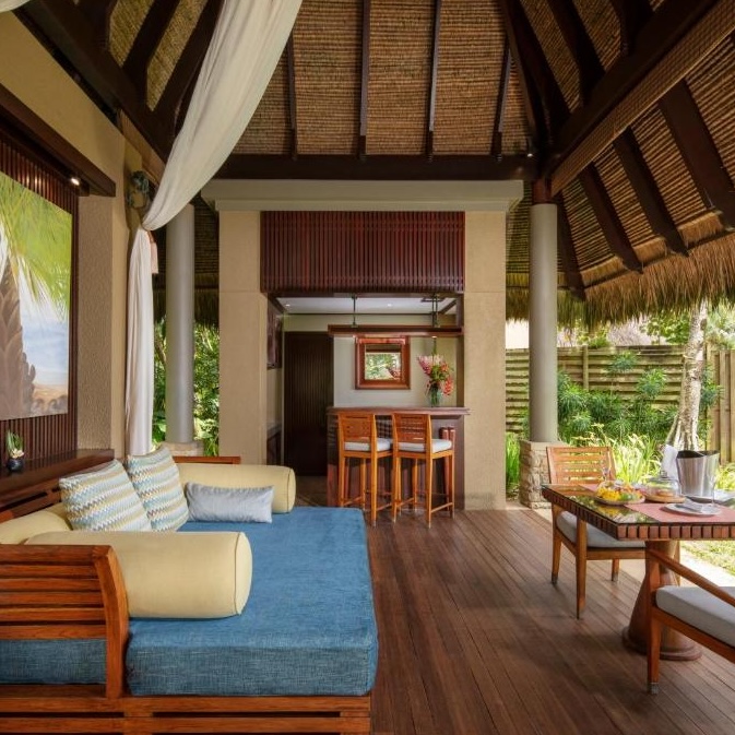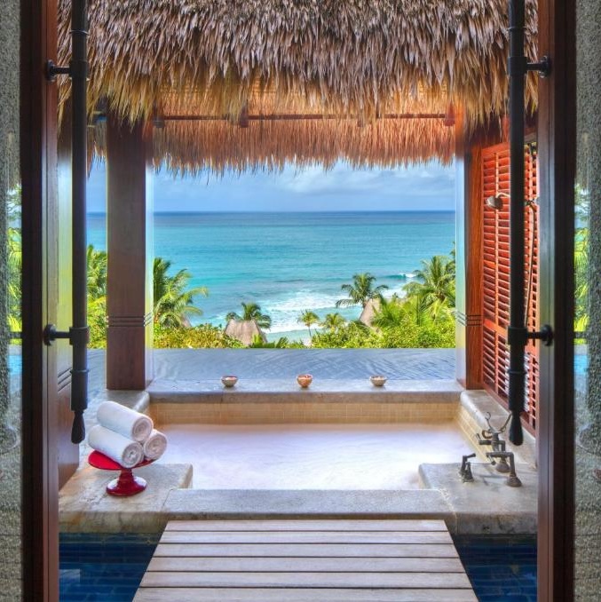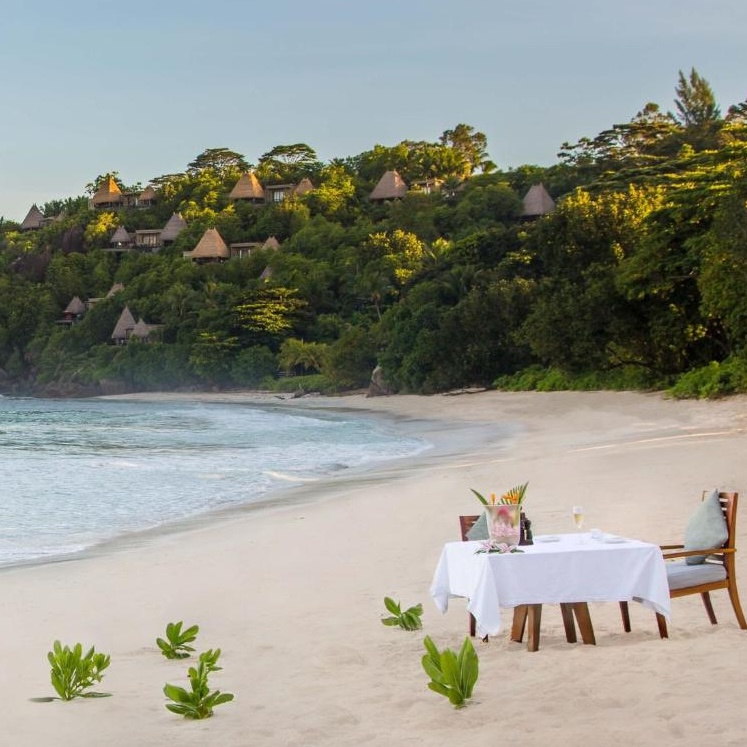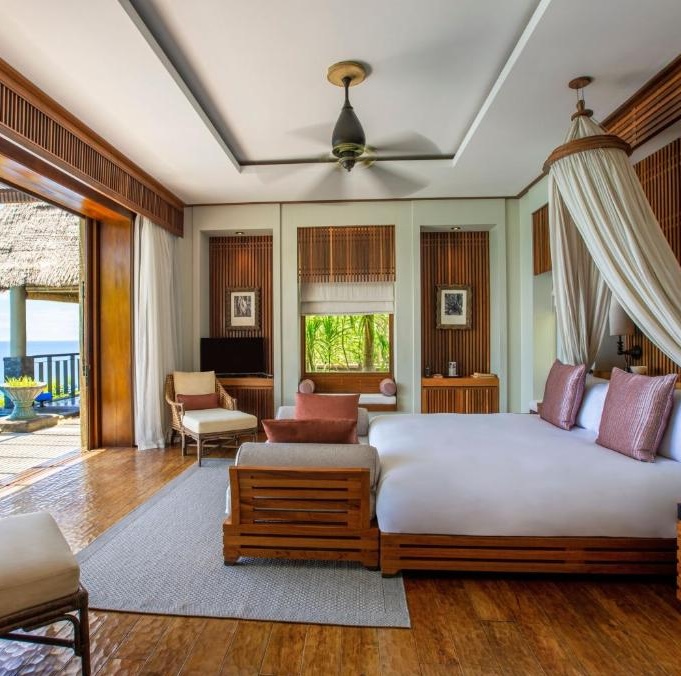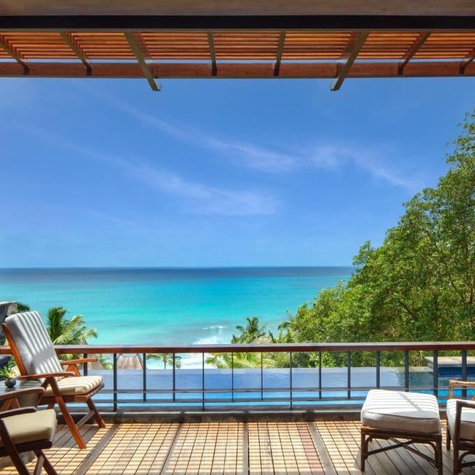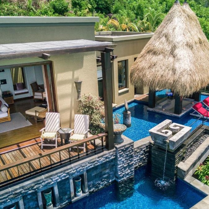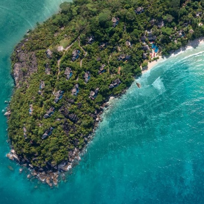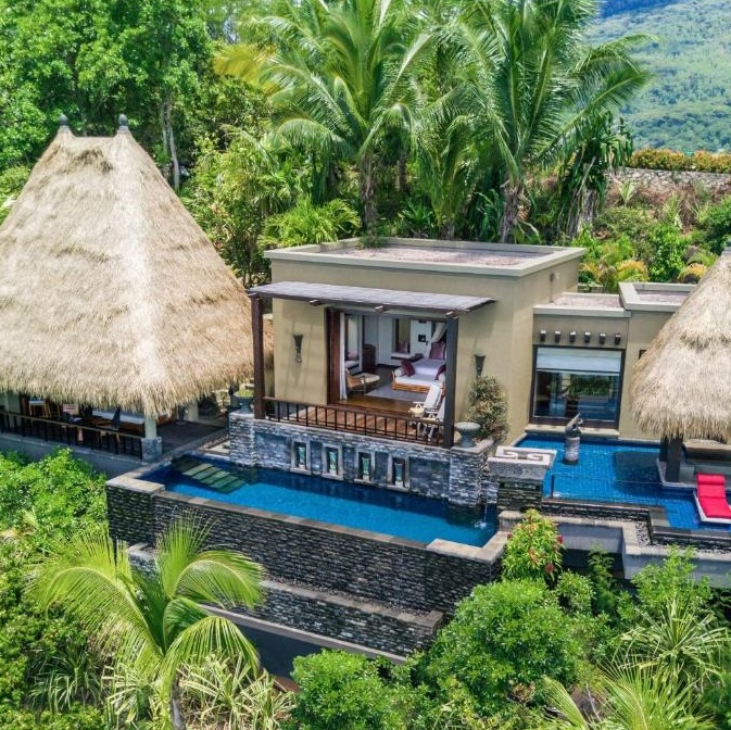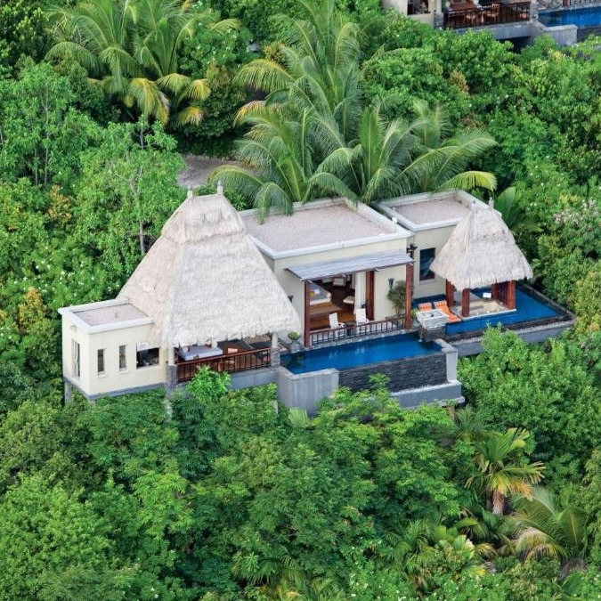 An inventive Asian-Mediterranean-Creole restaurant and a modern spa with open-air pavilions will see to it that you’ll never need venture off Maia’s grounds — and that twenty-four-hour butler service doesn’t hurt either. You can tour the island — or the neighboring islands — by boat or helicopter, and the array of water sports is quite comprehensive. Best of all it’s relatively accessible — though in its immediate situation it feels like the edge of the world, Maia’s Mahé island location means it’s only an airport transfer away.