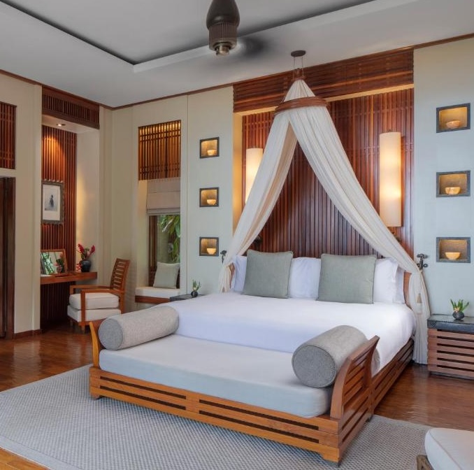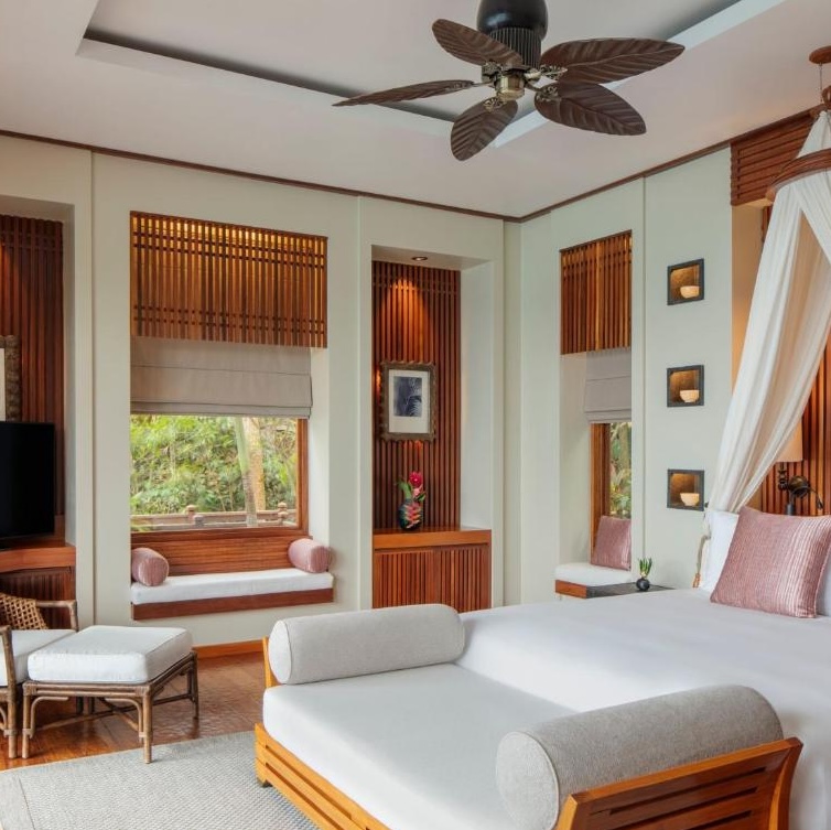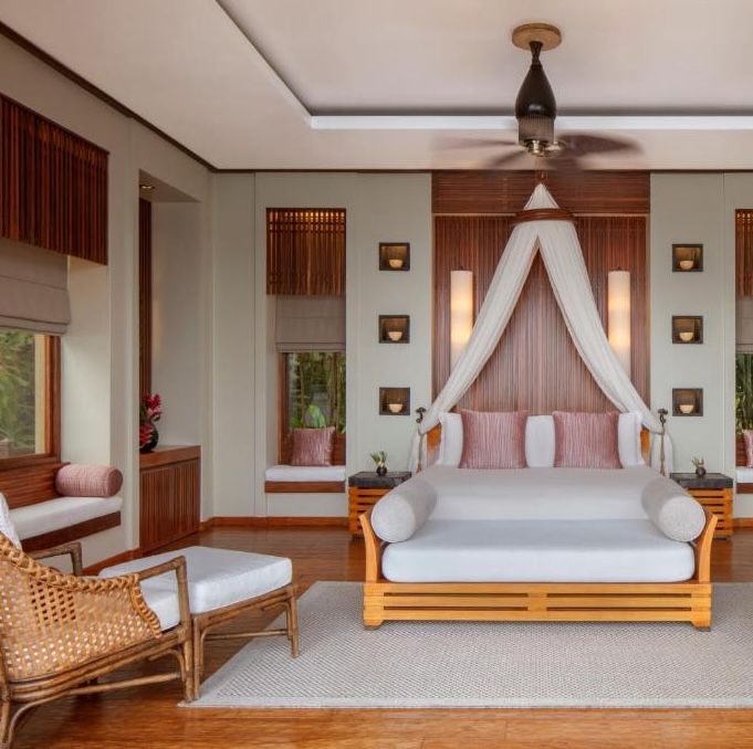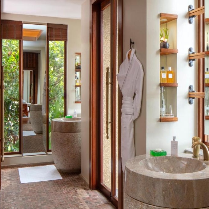 It’s an understated influence, and half the art of it is in integrating the villas into their environment. Bensley is a landscape architect as well, and there’s not always a clear line distinguishing these thirty villas, with their private indoor-outdoor space, from their environment. That’s the idea, anyway — the pool feels like some lost lagoon, and the views from the cliffside villas are jaw-dropping.