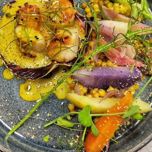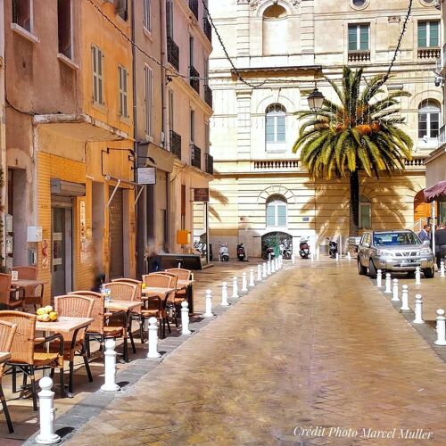 In this cobbled street of Toulon's old town, where the terrace is smoke-free from May to October, you can tuck into delicious "cuisine de producteurs" (as the chef calls his cooking). A champion of local produce and the terroir, he concocts good seasonal dishes with a fondness for vegetables – to wash down with natural and organic tipples: ravioli, burratina and a poultry jus with chanterelles; thin slices of Aveyron pork, potato gratin with Le Beausset saffron and organic vegetables from Provence; roast Solliès figs and arlette biscuit.