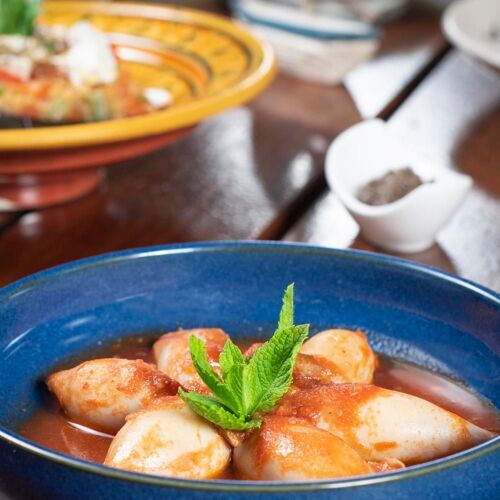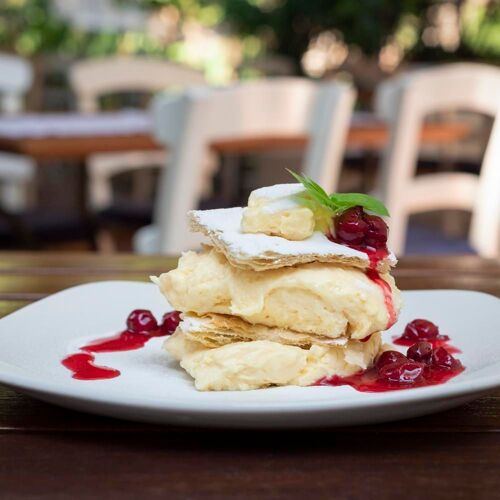 Both the bright decor and colourful tableware at this restaurant demonstrate the light, happy spirit of the Mediterranean, as does the array of tempting dishes on the menu, including chickpea fritters, tzatziki, different kinds of olives, typical “Dokos” from Crete (imaginatively flavoured croutons), as well as chicken and pork gyros. This is a pleasant, informal setting in which to enjoy traditional Greek cuisine, with a cool, relaxed outdoor space in a shady courtyard that adds to its appeal, making it very popular with locals.