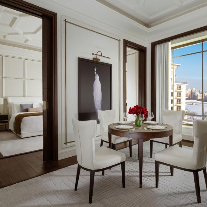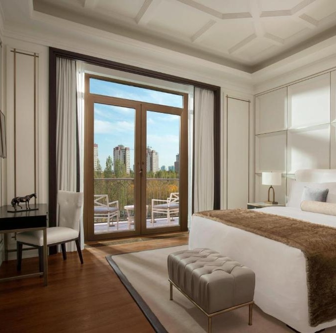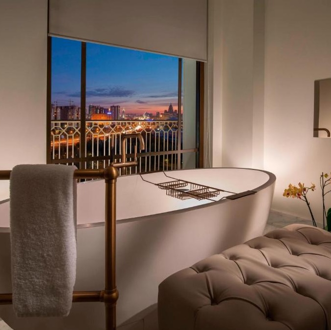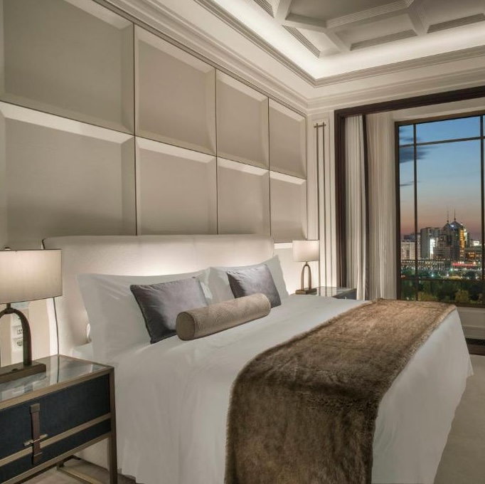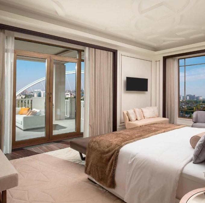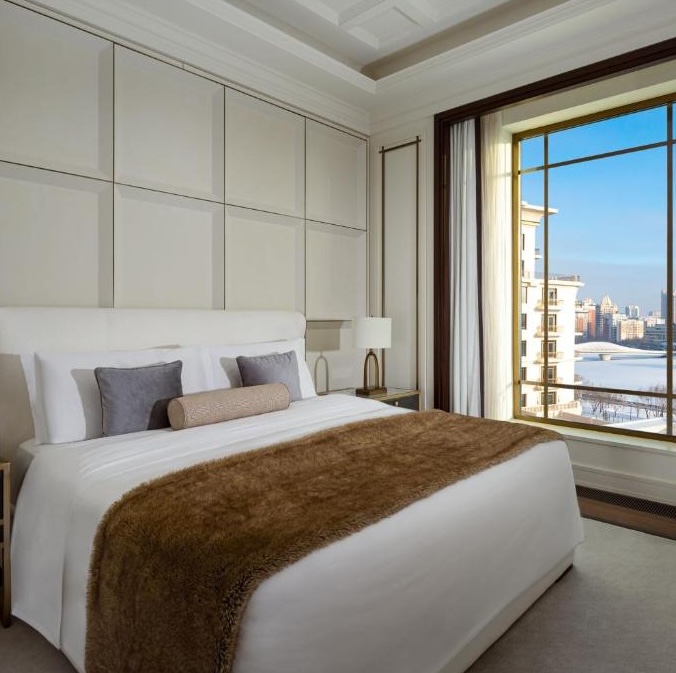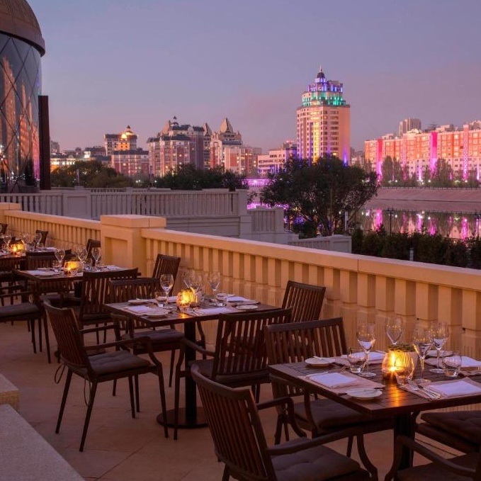 The St. Regis Astana stands on the banks of the Ishim River, between the city's older eastern quarters and its ambitious western skyline, think futuristic tents and golden monuments to mythological birds. The hotel's yurt-shaped entrance evokes Kazakhstan's nomadic past; inside, lattice walls and indigo murals keep the references subtle. All 120 rooms start at 68 square meters, with floor-to-ceiling windows, separate living areas, and bathrooms built for long soaks on cold nights. At the St. Regis Bar, they'll pour you a Bloody Mary made with local cheese and Aral Sea salt. Every property has its own version, and this one tastes like Central Asia.