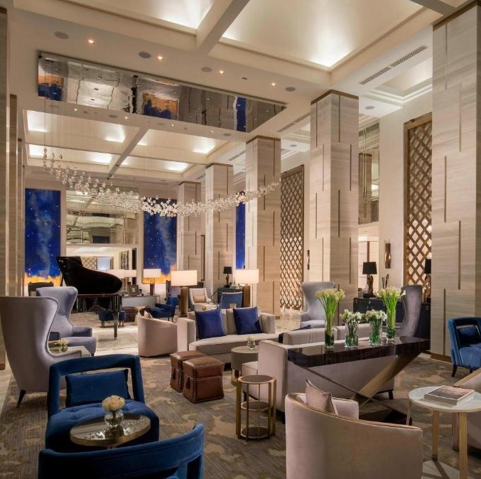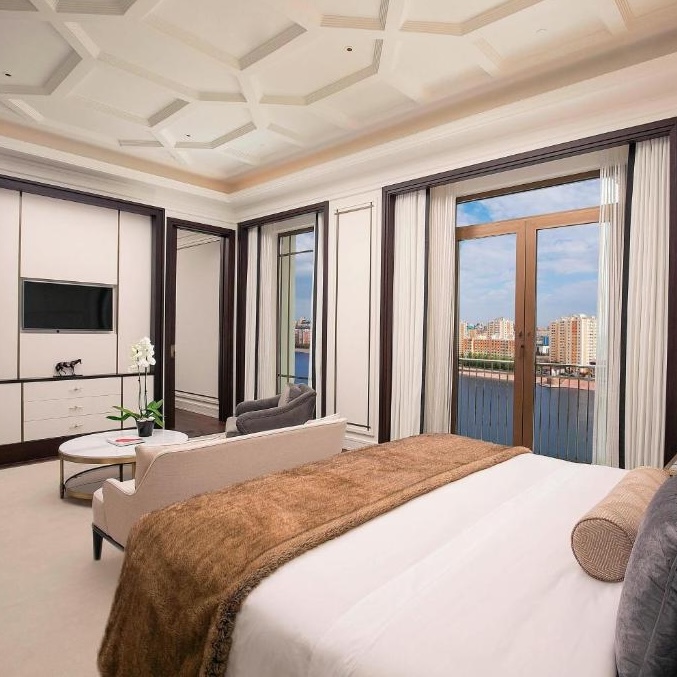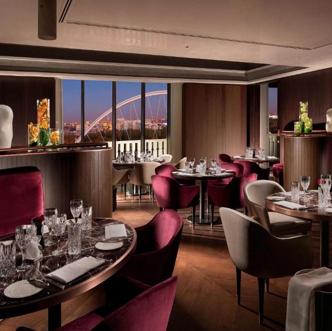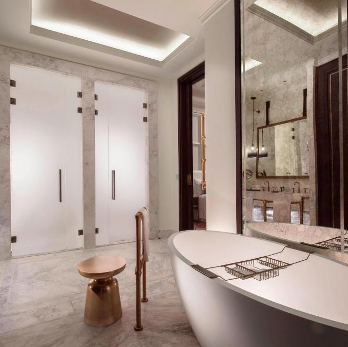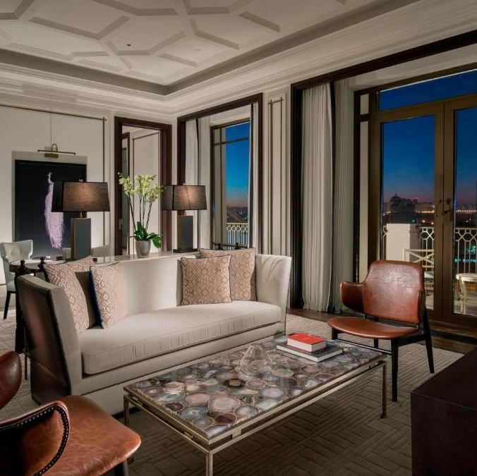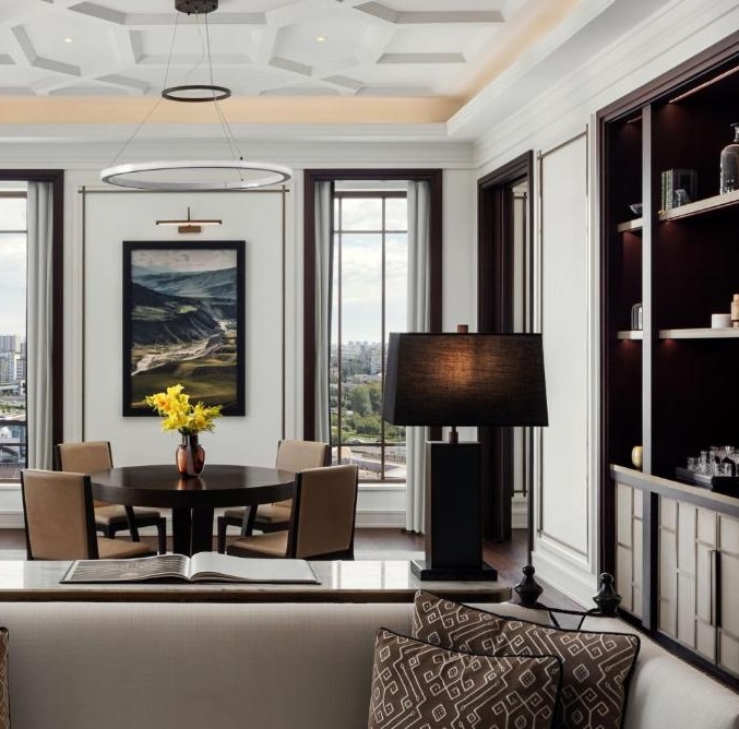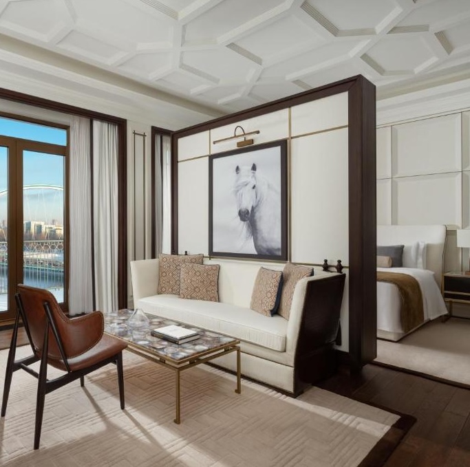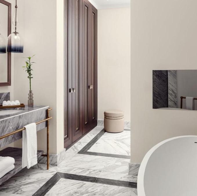 The St. Regis Astana stands on the banks of the Ishim River, between the city's older eastern quarters and its ambitious western skyline, think futuristic tents and golden monuments to mythological birds. The hotel's yurt-shaped entrance evokes Kazakhstan's nomadic past; inside, lattice walls and indigo murals keep the references subtle. All 120 rooms start at 68 square meters, with floor-to-ceiling windows, separate living areas, and bathrooms built for long soaks on cold nights. At the St. Regis Bar, they'll pour you a Bloody Mary made with local cheese and Aral Sea salt. Every property has its own version, and this one tastes like Central Asia.