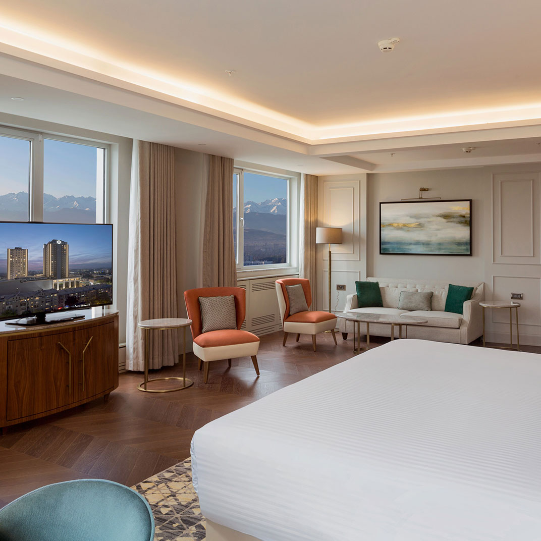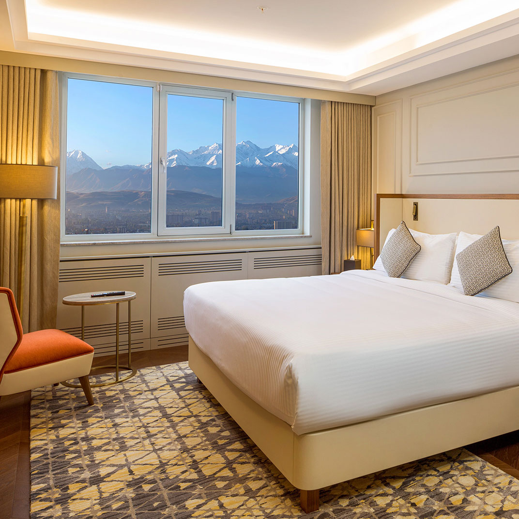 Sheraton Bishkek rises 88 meters as Kyrgyzstan's tallest building, though the cranes across the skyline suggest that won't last long. What will endure are the views from Iwa, the rooftop restaurant and bar where the Kyrgyz Ala-Too mountains stack up to the south as Kazakhstan's plains stretch north. The Japan-inspired dining room fills each evening with locals ordering ribeye yakiniku and king crab sushi rolls, a five-piece band playing through dinner service. Opened in 2019 for business travelers, the hotel delivers wood-paneled rooms and marble bathrooms that do the job without fanfare.