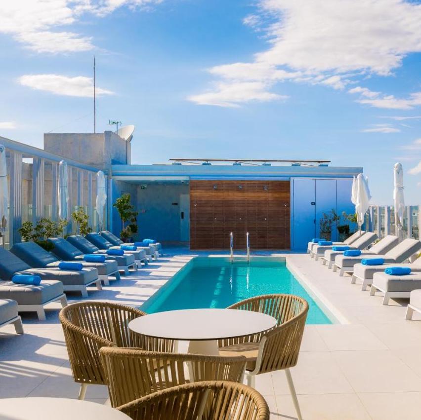 The Hotel Indigo in central Larnaca stitches together a row of old townhouses into a four-story hotel, keeping the original stone archways and vaulted ceilings intact. The lobby passes through one of these preserved arches, and rooms feature rainfall showers, balconies, vintage rotary phones. The rooftop pool looks out over the Mediterranean and the city's palm-lined promenade, which runs to Finikoudes Beach a few minutes' walk away. Oinotelia Wine Bar operates on the ground floor, pouring local and international bottles in the courtyard. The hotel is situated near the 9th-century Church of St. Lazarus and Larnaca's medieval castle, both of which are a short walk away.