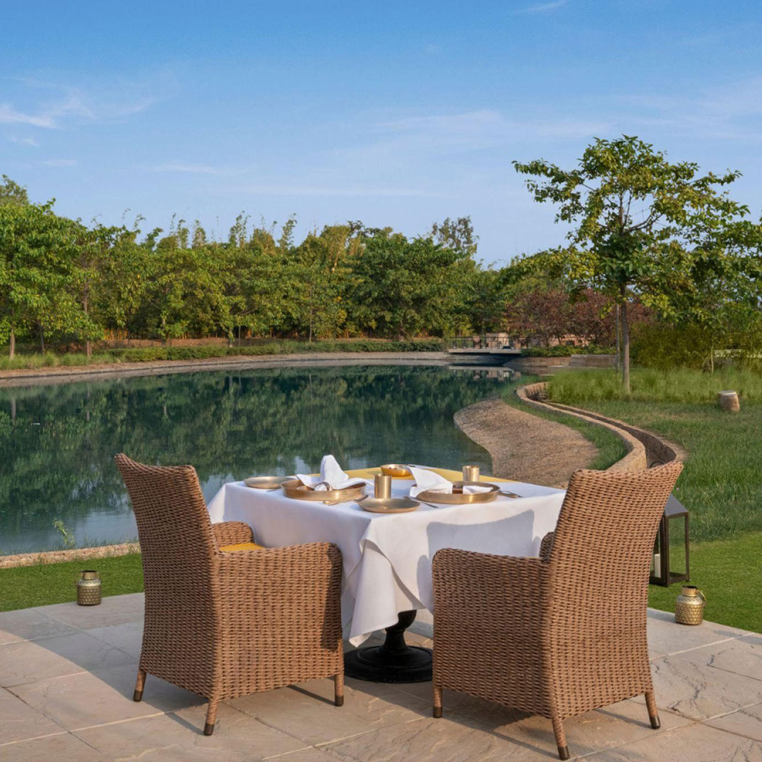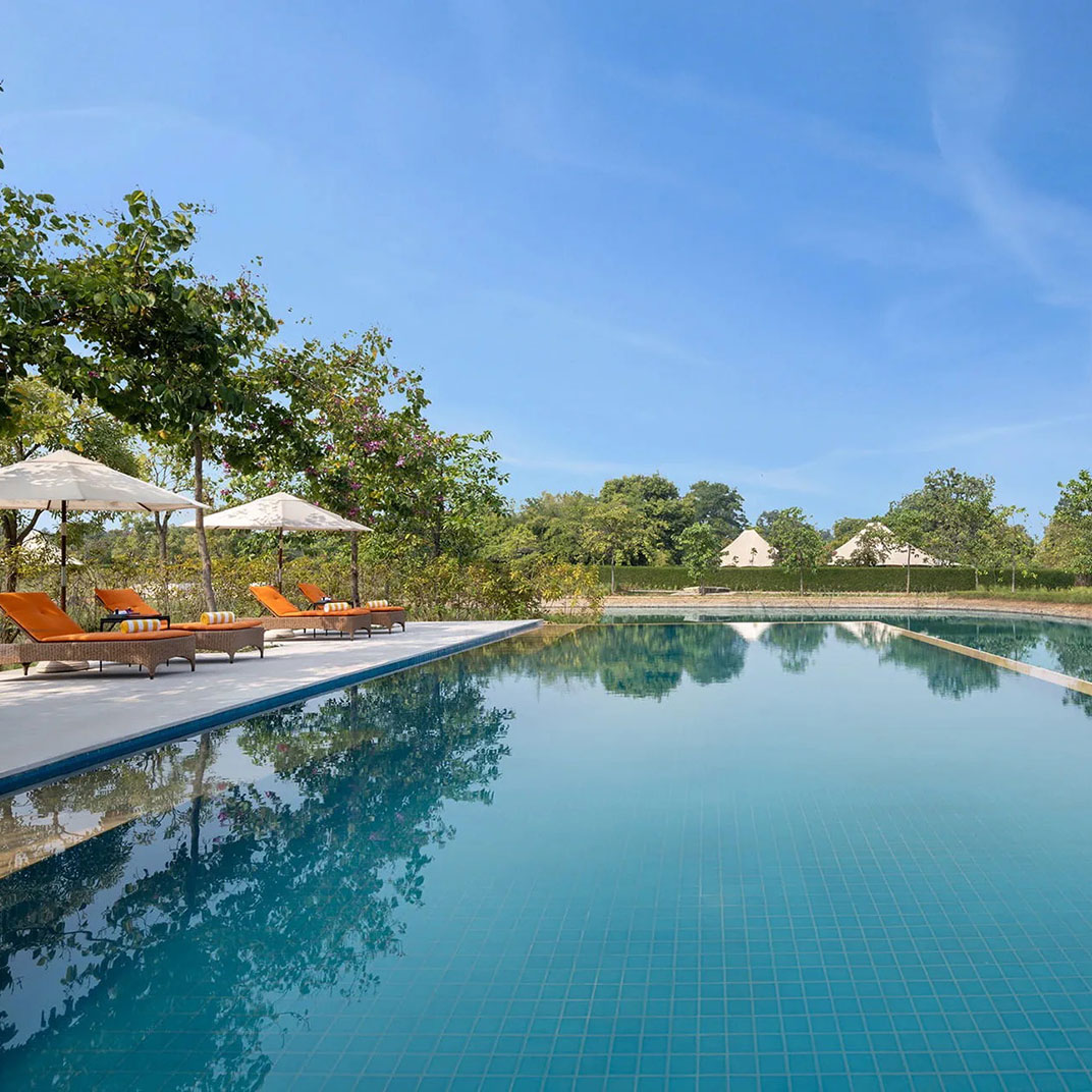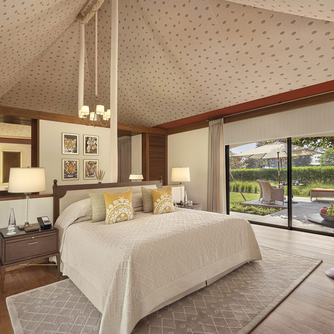 The newest addition to the “Vilas” properties, The Oberoi Vindhyavilas sits just beyond the gates of Bandhavgarh National Park, a landscape known for its remarkable tiger population. Spread across 21 acres, the resort is composed of tented suites and pool villas set in private gardens with decks overlooking fields and forest. Inside, canopied ceilings, Gond artworks, and hand-painted studies of local wildlife anchor the spaces to their setting. With a spa, tranquil lake views, and safaris at dawn, it offers immersion in the wilderness with the hallmarks of Oberoi hospitality.