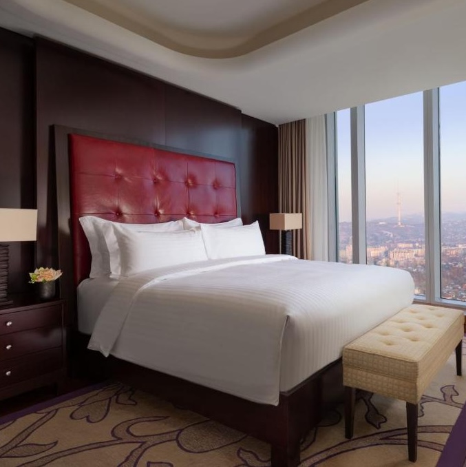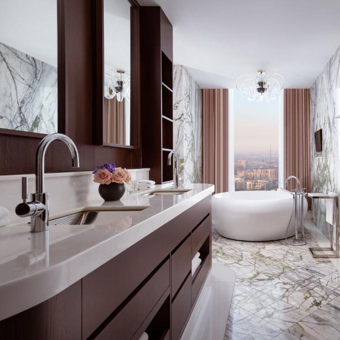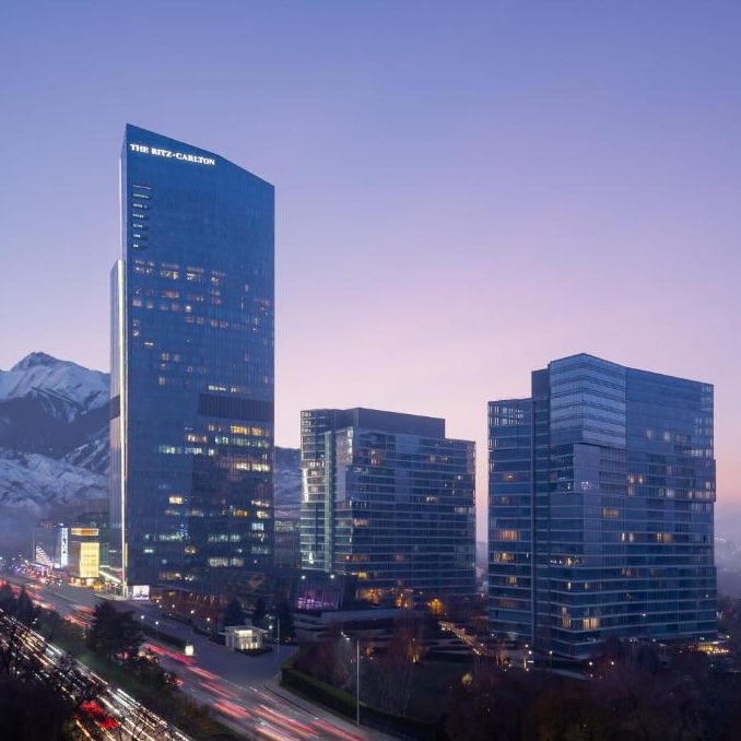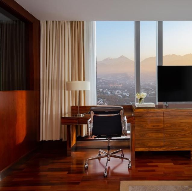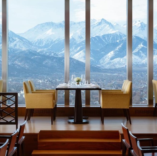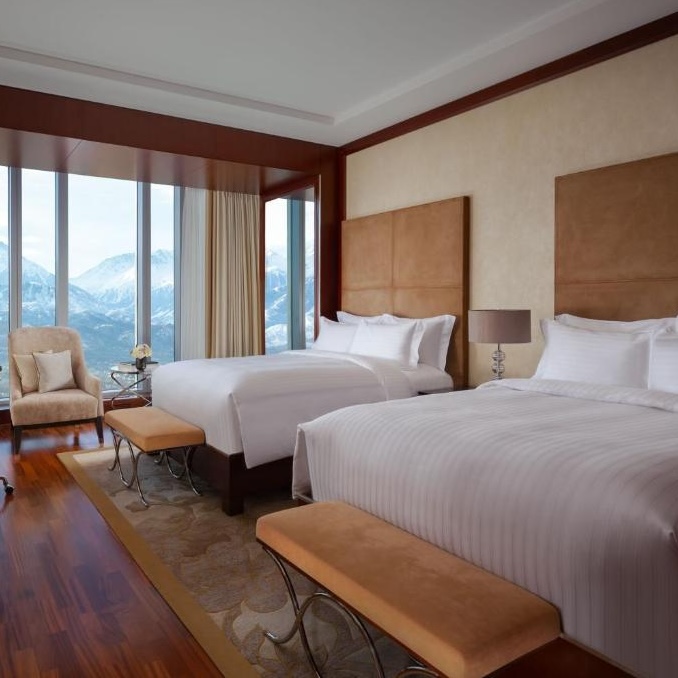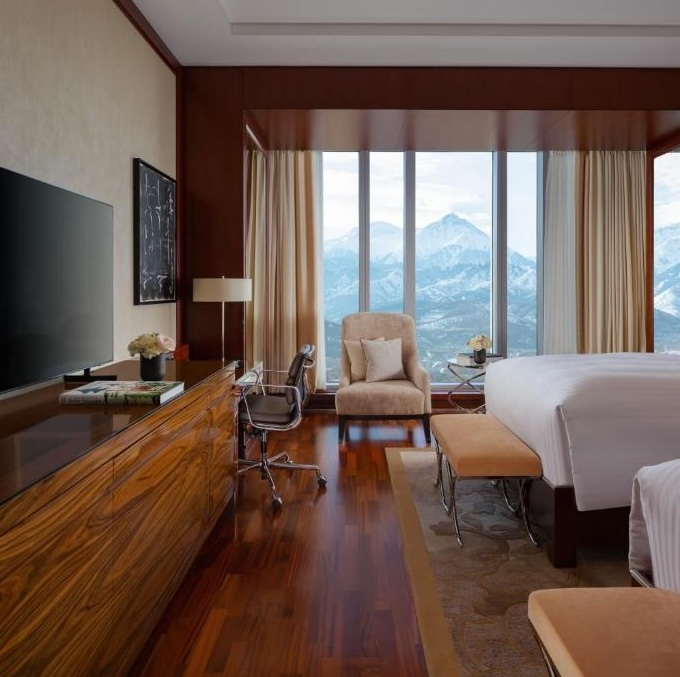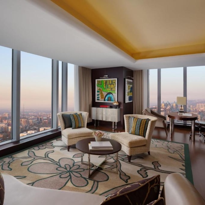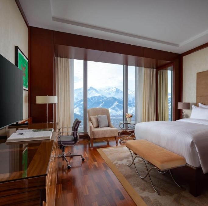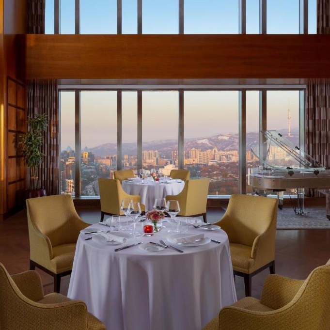 The Ritz-Carlton, Almaty climbs floors 21 through 30 of the Esentai Tower, where the snow-capped Alatau Mountains fill nearly every window. The 145 rooms come with freestanding tubs, heated bathroom floors, and Diptyque amenities, the kind of details that matter when you're this high up. Crystal chandeliers punctuate the marble lobby, while the 30th-floor Vista Restaurant serves breakfast with wall-to-wall mountain views. At Seven Bar & Restaurant, the Le Petit Chef experience uses 3D projection mapping to animate your dinner plate. The spa includes a hammam, sauna, and indoor pool. It is precise luxury hospitality, executed several hundred feet above the city.
