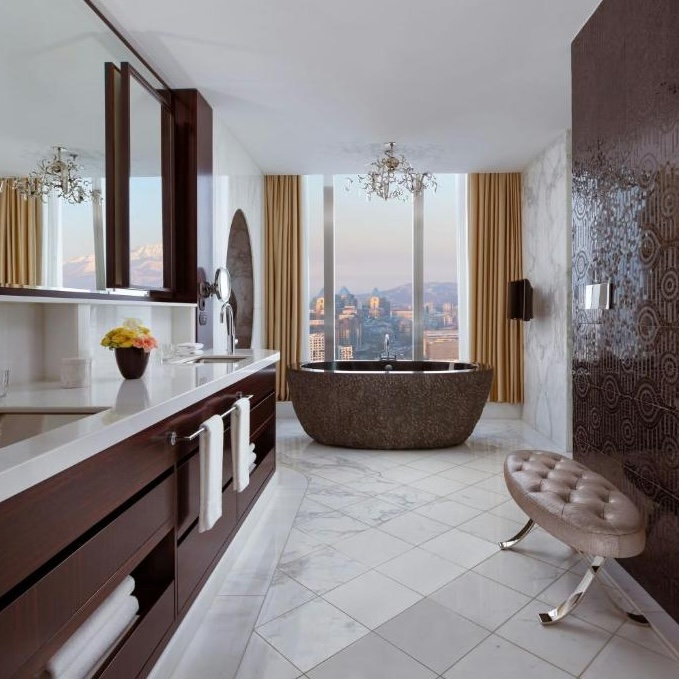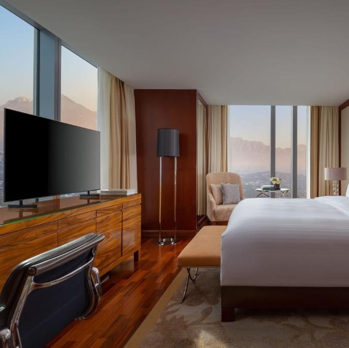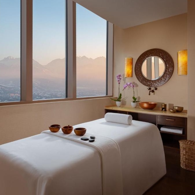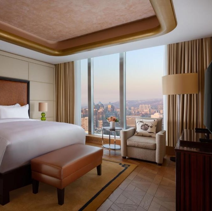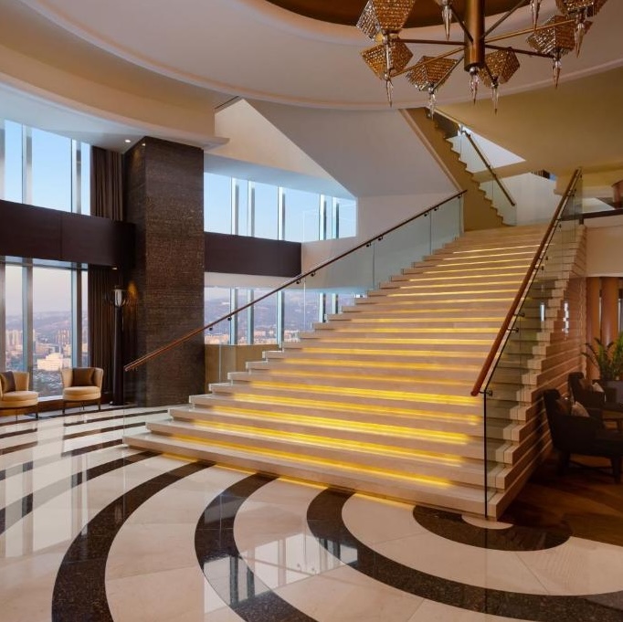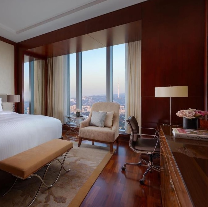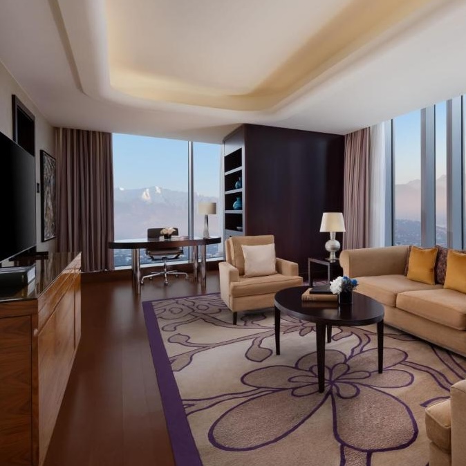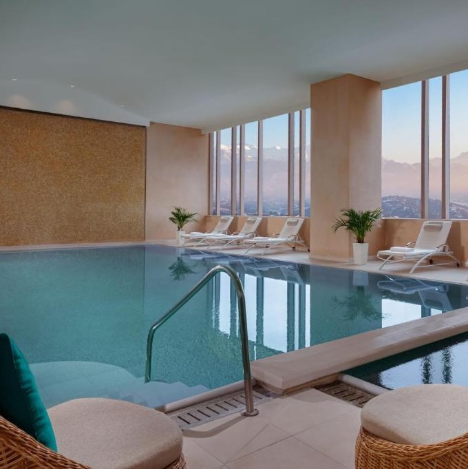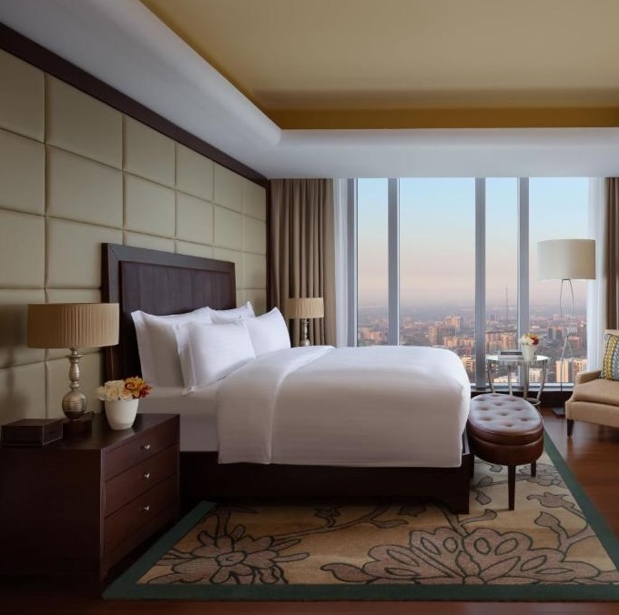 The Ritz-Carlton, Almaty climbs floors 21 through 30 of the Esentai Tower, where the snow-capped Alatau Mountains fill nearly every window. The 145 rooms come with freestanding tubs, heated bathroom floors, and Diptyque amenities, the kind of details that matter when you're this high up. Crystal chandeliers punctuate the marble lobby, while the 30th-floor Vista Restaurant serves breakfast with wall-to-wall mountain views. At Seven Bar & Restaurant, the Le Petit Chef experience uses 3D projection mapping to animate your dinner plate. The spa includes a hammam, sauna, and indoor pool. It is precise luxury hospitality, executed several hundred feet above the city.