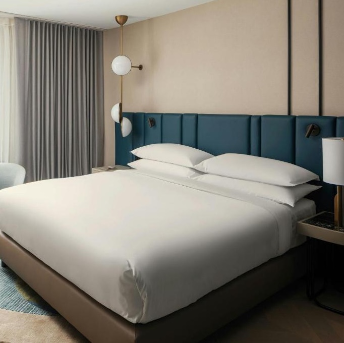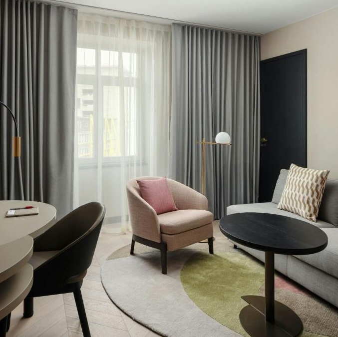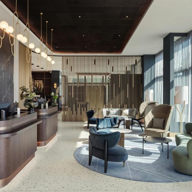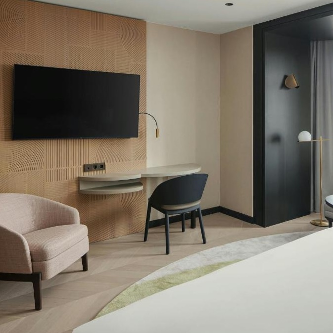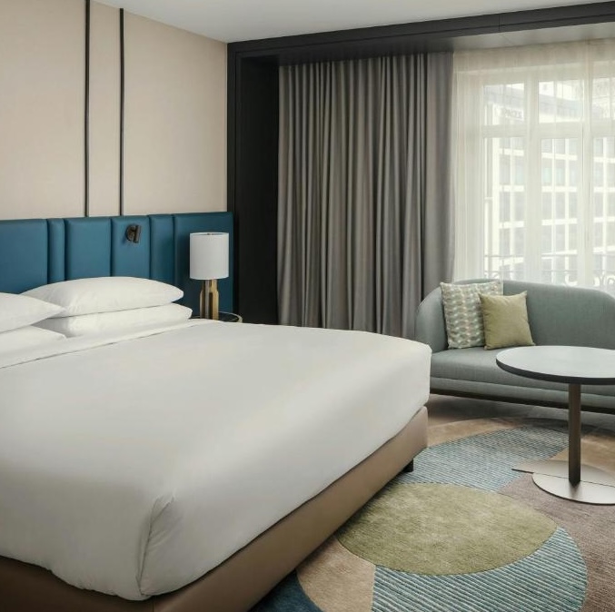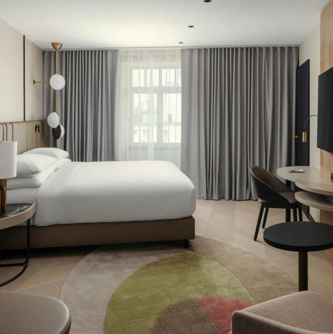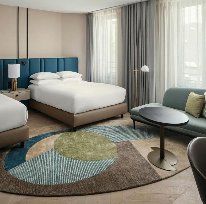 The Marriott Alfa stands opposite Luxembourg’s central station, freshly renovated yet true to its art deco origins. Inside, geometric motifs, rich wood, and vintage furnishings preserve the spirit of its early decades without feeling staged. Brasserie Alfa runs the ground floor, serving locals alongside hotel guests throughout the day. Rooms on upper floors are smaller and snugger, better for quick stays, while the larger options offer more space. Five meeting rooms and a gym handle the business requirements. The renovation preserved the building's 20th-century character while updating everything that needed updating.