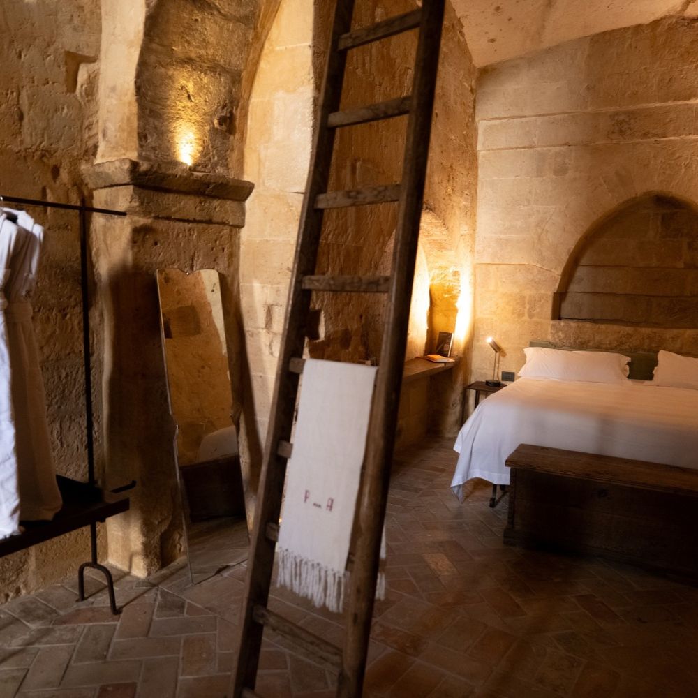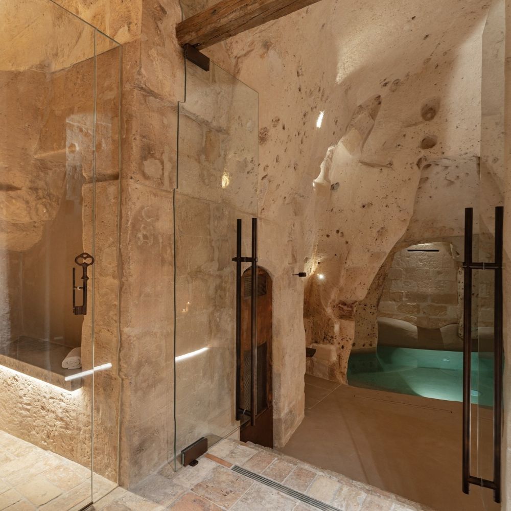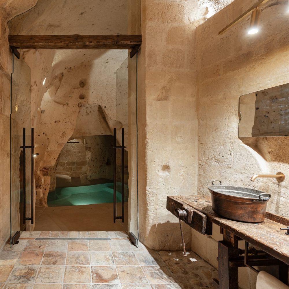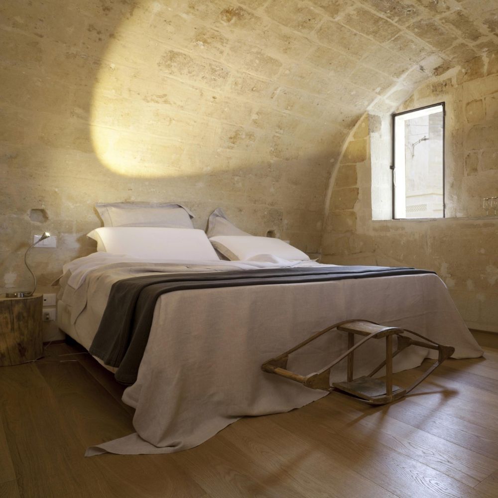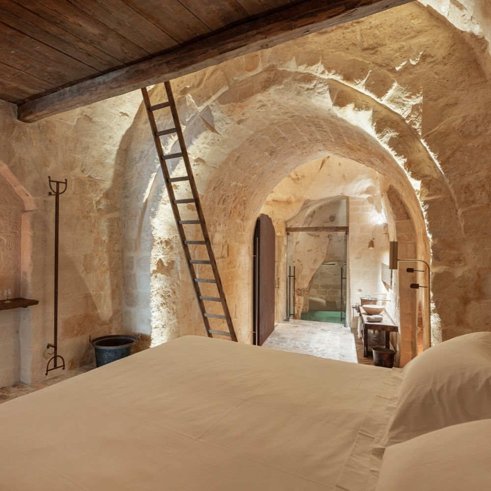 Matera's Sassi district carved these cave dwellings centuries ago, and Corte San Pietro keeps them intact: vaulted tufa ceilings, original stone walls, wooden ladders leaning against arches. Suites spread across multiple buildings in an albergo diffuso setup, each one different but sharing the same palette: light brown stone, recycled wood furniture, Corten steel accents. Small "wolf's mouth" windows let in soft light, linen curtains hang over original doors. Some suites add private spas tucked into the rock chambers. The old street numbers stayed on the doors, so rooms go by their historical addresses rather than sequential hotel numbering. Courtyards remain communal, just as they were when families lived here.