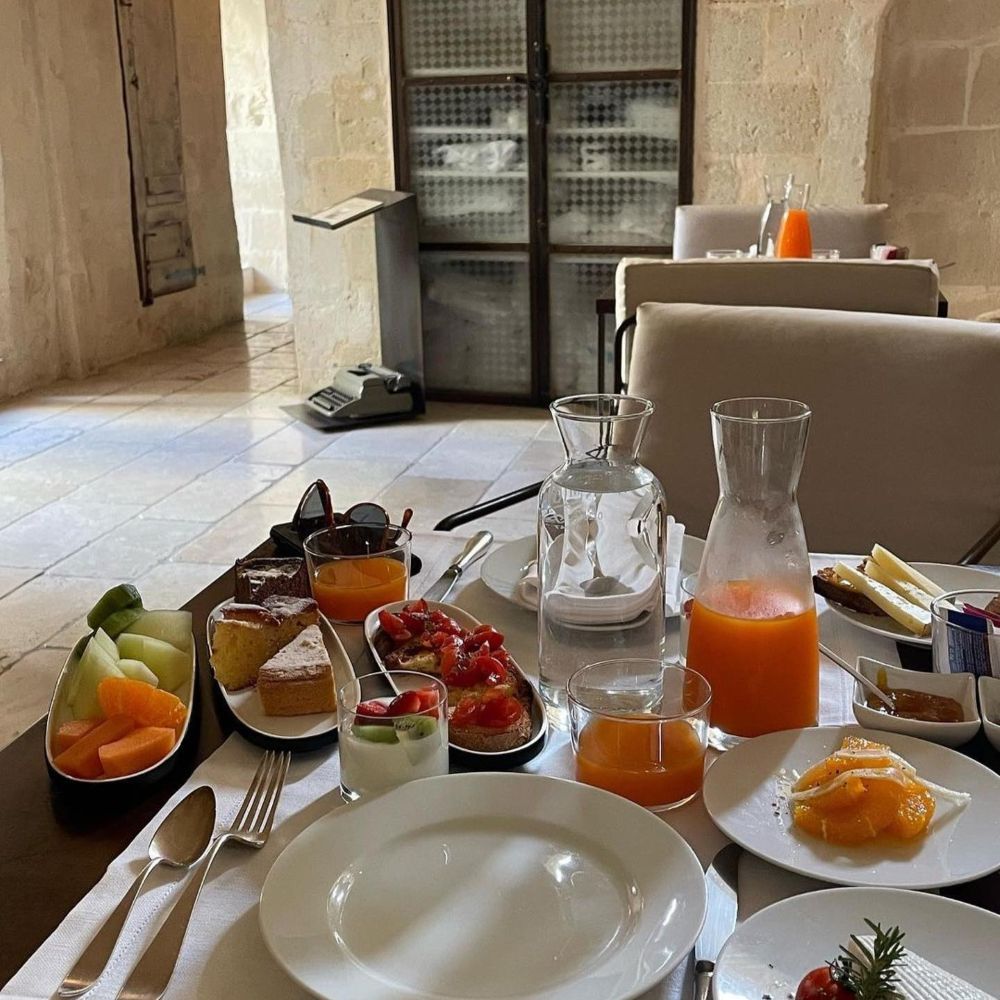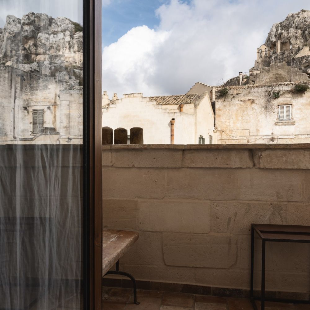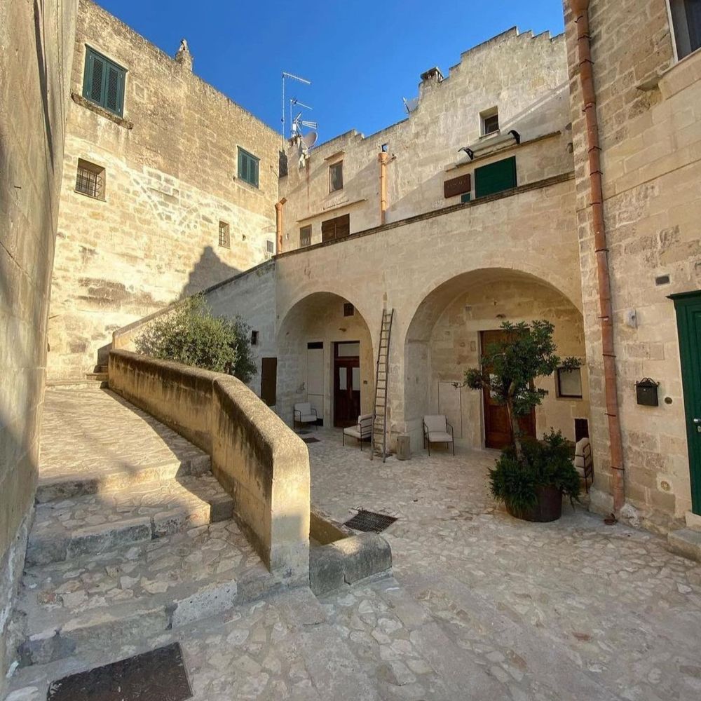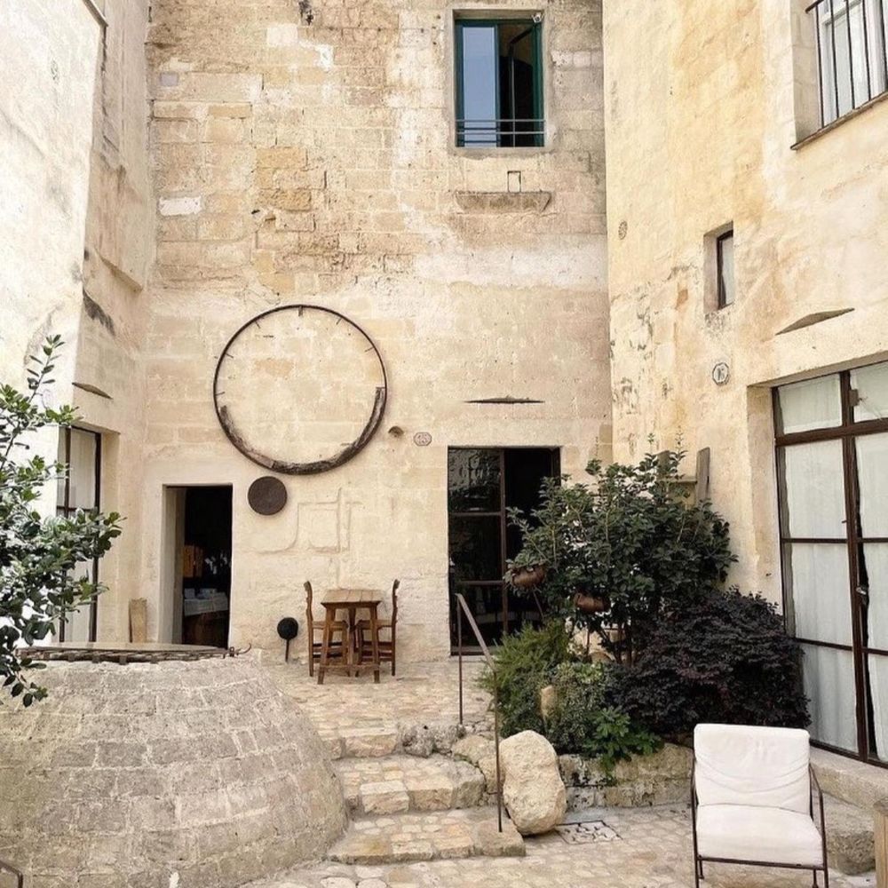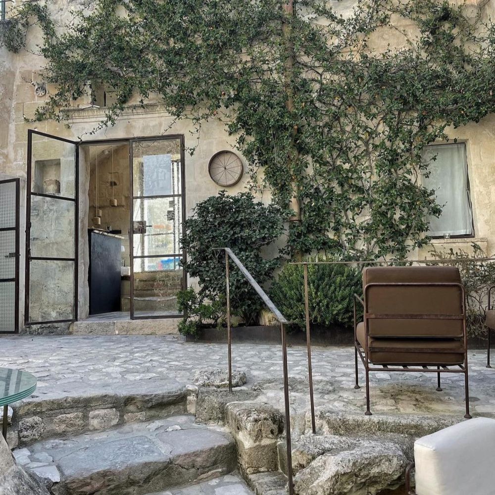 Matera's Sassi district carved these cave dwellings centuries ago, and Corte San Pietro keeps them intact: vaulted tufa ceilings, original stone walls, wooden ladders leaning against arches. Suites spread across multiple buildings in an albergo diffuso setup, each one different but sharing the same palette: light brown stone, recycled wood furniture, Corten steel accents. Small "wolf's mouth" windows let in soft light, linen curtains hang over original doors. Some suites add private spas tucked into the rock chambers. The old street numbers stayed on the doors, so rooms go by their historical addresses rather than sequential hotel numbering. Courtyards remain communal, just as they were when families lived here.